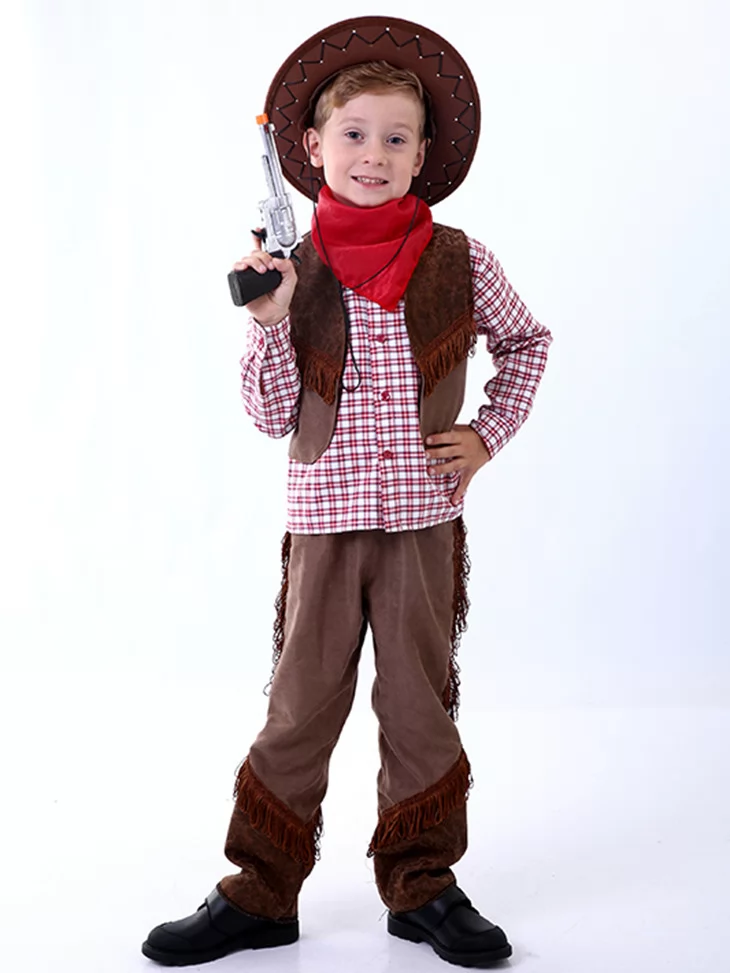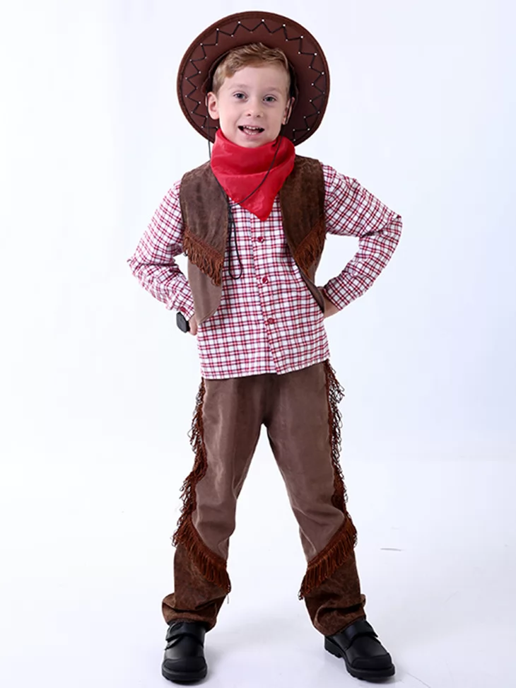 Цей харизматичний образ переносить у атмосферу пригод і сміливих героїв Дикого Заходу. Класичне поєднання клітинки, замшевих фактур і ковбойського капелюха створює впізнаваний та веселий силует. Чудовий варіант для оренди карнавальних костюмів на дитячі свята, виступи та фотосесії.