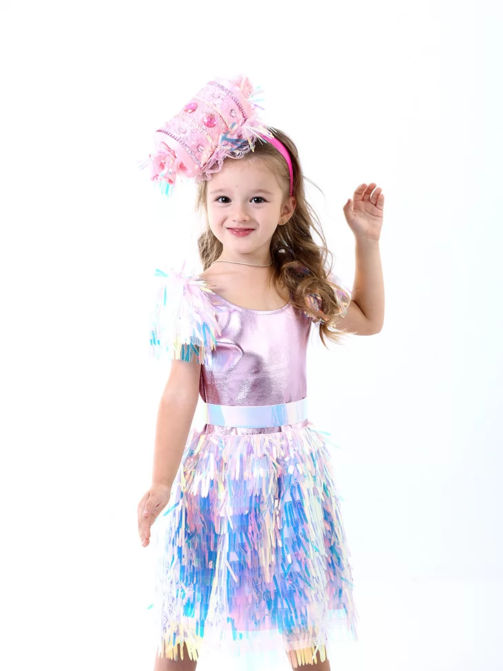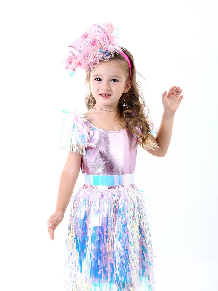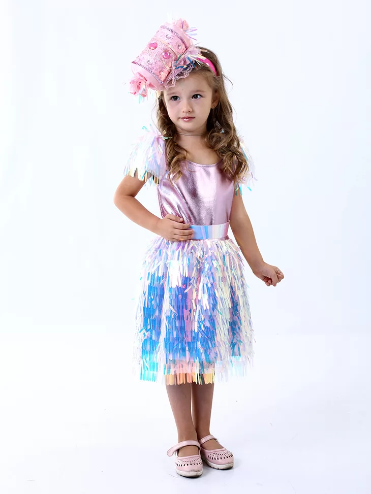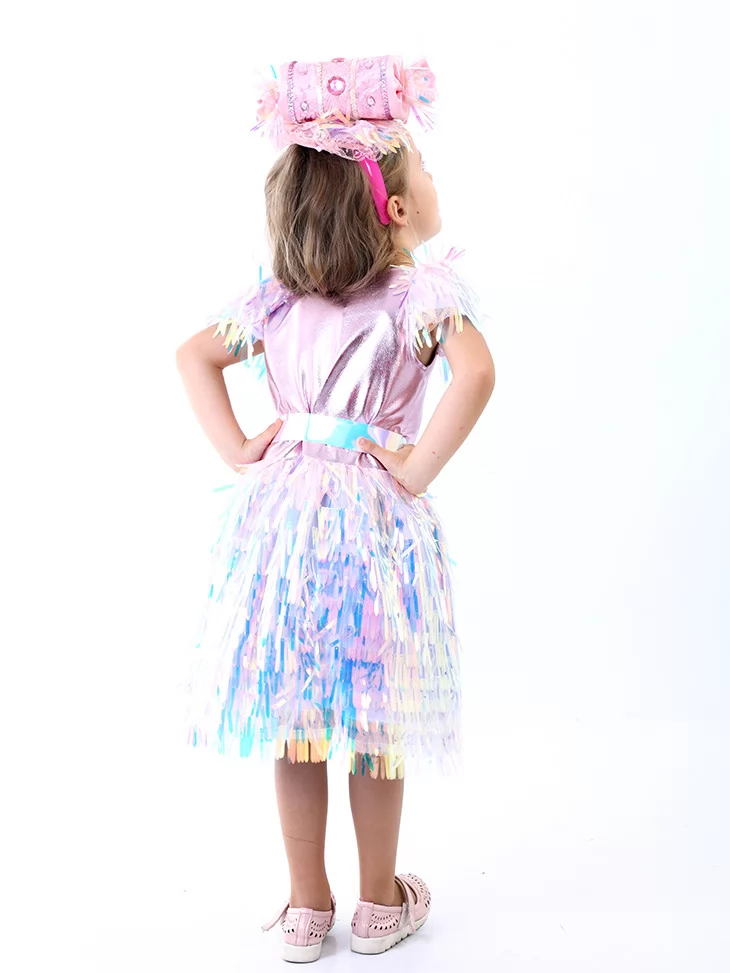 Яскравий, грайливий та неймовірно блискучий образ, що нагадує святковий феєрверк із солодких барв та конфетті. Металізований рожевий верх гармонійно поєднується з переливчастою спідницею, яка створює ефект святкового вибуху кольору. Декоративний капелюшок у стилі солодкої цукерки додає образу оригінальності та настрою карнавалу. Це ідеальний варіант для оренди карнавальних костюмів на новорічні свята, тематичні вечірки, виступи та яскраві фотосесії.