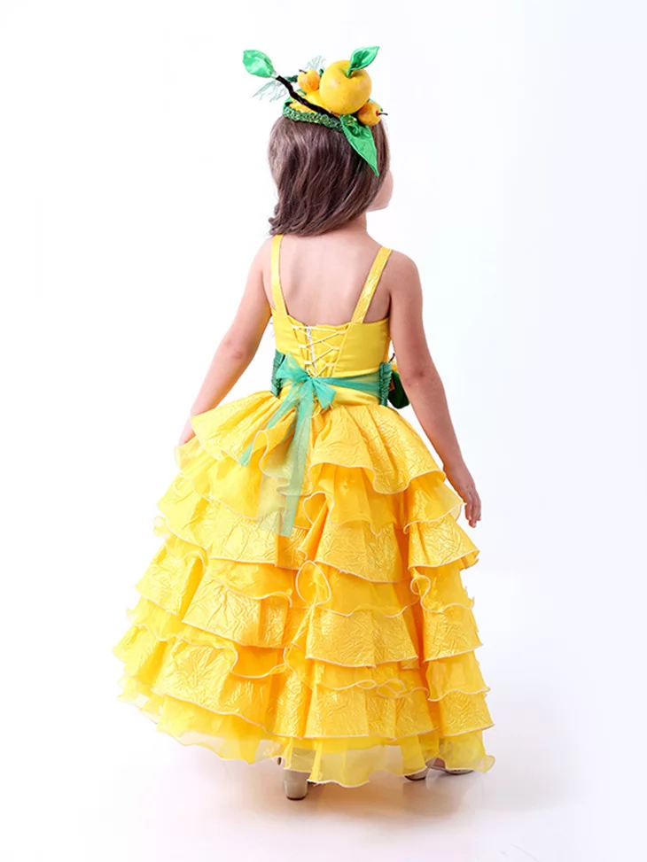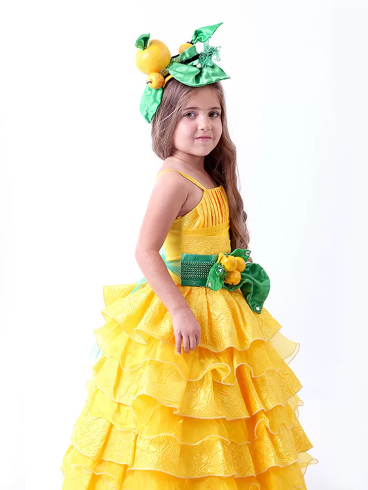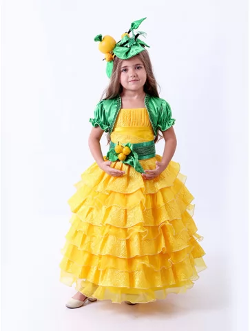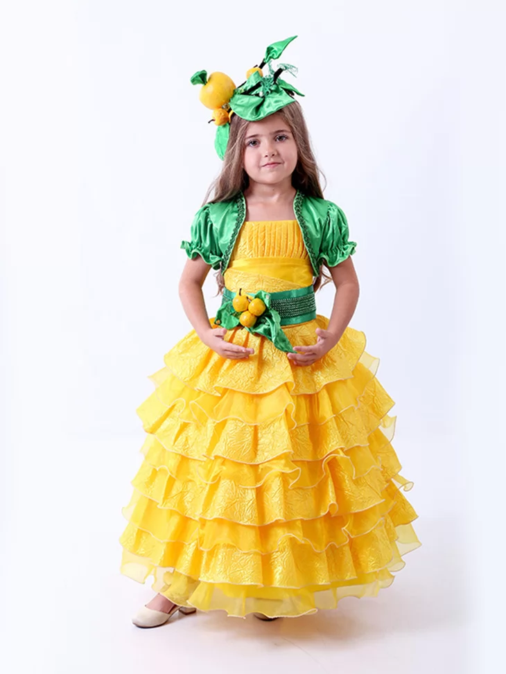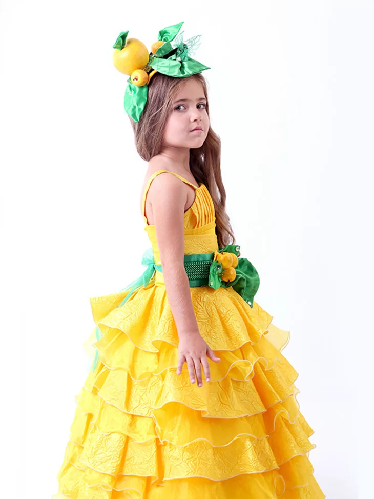 Теплий, яскравий і по-дитячому казковий образ стиглого яблучка, що ніби щойно впало з чарівного дерева в літньому саду. Насичений жовтий колір сукні створює відчуття сонця та радості, а зелені листочки додають образу живості й природної ніжності. Пишна багатошарова спідниця красиво коливається під час руху, роблячи костюм святковим і дуже фотогенічним. Це чудовий вибір для оренда карнавальних костюмів на ранки, тематичні свята та яскраві дитячі виступи, де хочеться створити справжню атмосферу казки.