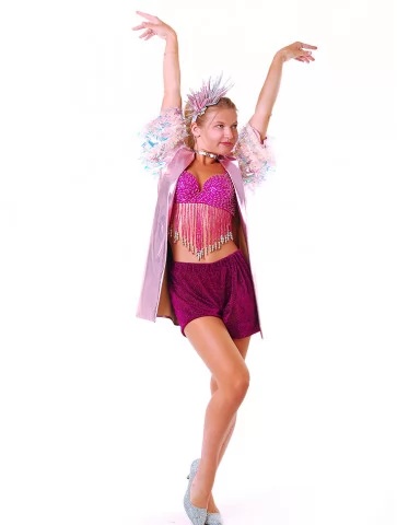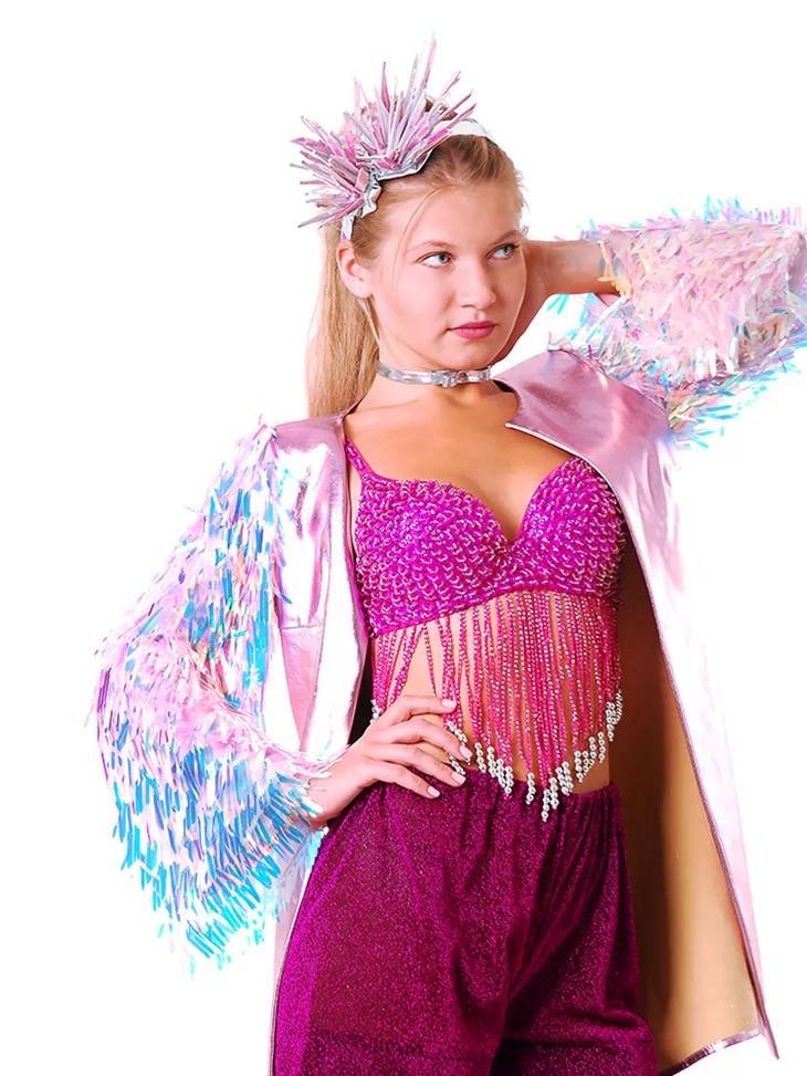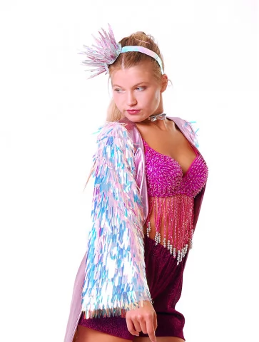 Яскравий, сміливий та енергійний образ, натхненний вибуховою атмосферою диско 70–90-х років.Блискучий топ з бахромою рухається в такт кожному кроку, короткі шорти підкреслюють динаміку танцю, а жилет з неоновими акцентами та ефектний головний убір створюють сценічний, впізнаваний силует. Це ідеальний варіант для оренда карнавальних костюмів, коли хочеться максимум драйву, світла й свободи руху.