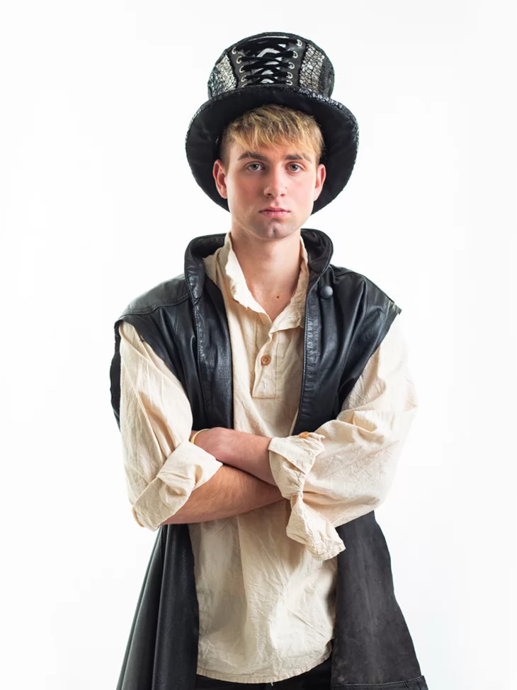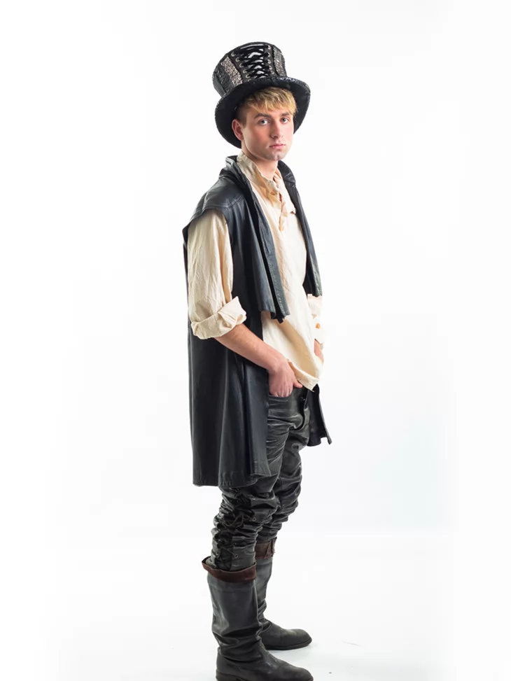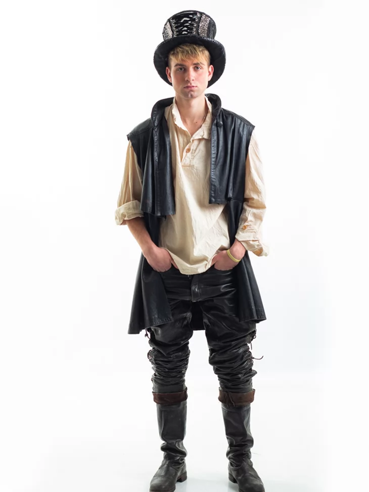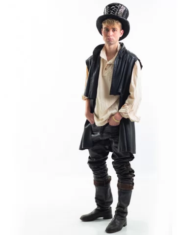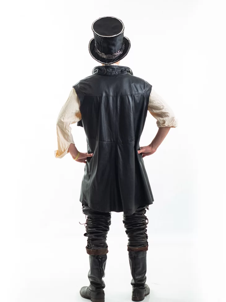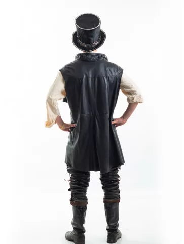 Цей чоловічий костюм в оренду у стилі стімпанк — ідеальне поєднання класичного середньовічного шарму та сучасної екстравагантності. Образ Чарівника-Скитальця створений для тих, хто прагне виділитись на будь-якій вечірці або сцені. Чорна шкіра, вільна сорочка та високий капелюх зі вставками — цей лук неможливо не помітити. Прокат карнавальних костюмів дозволяє втілити яскравий образ без зайвих витрат.