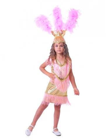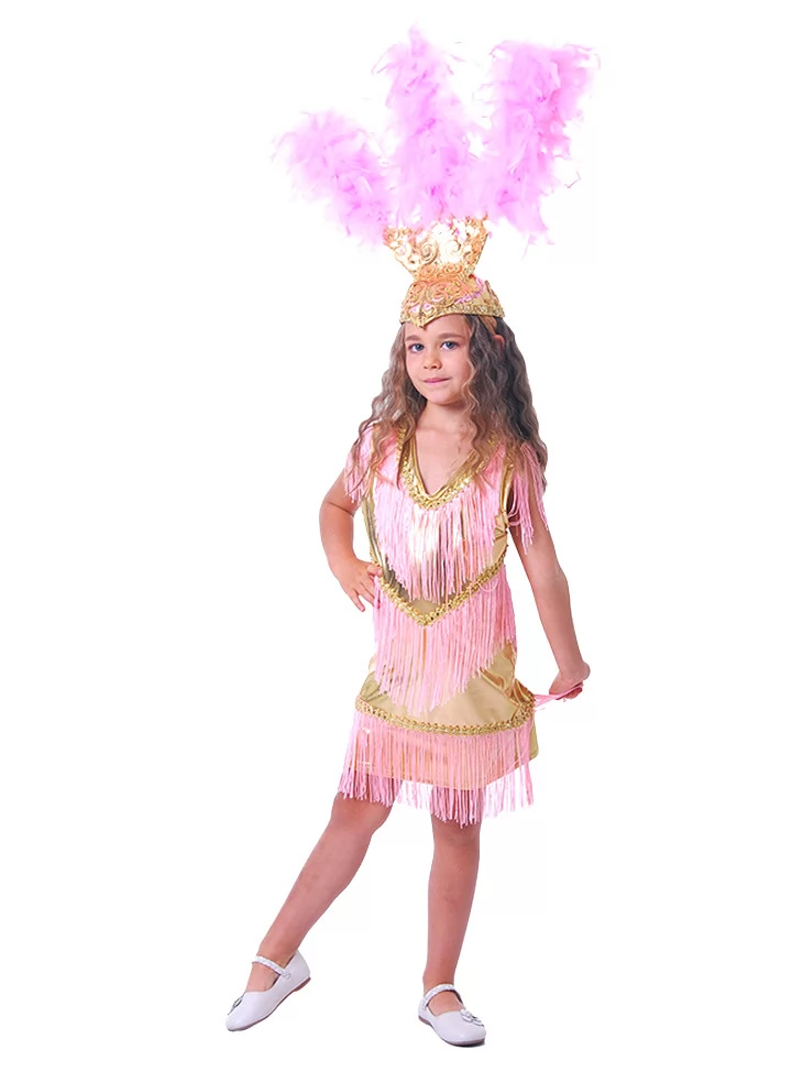Ніжний, святковий образ у стилі бразильського карнавалу, що поєднує легкість руху, яскраві емоції та сценічний блиск. Рожева бахрома красиво коливається під час танцю, а золотисті акценти й пишний головний убір з пір’ям створюють справжню атмосферу самби. Ідеальний вибір для оренда карнавальних костюмів на виступи, шоу та тематичні свята.
