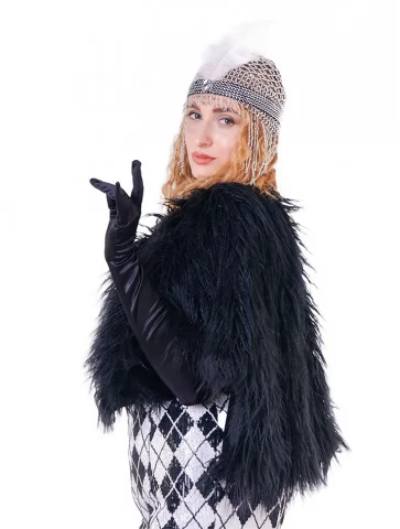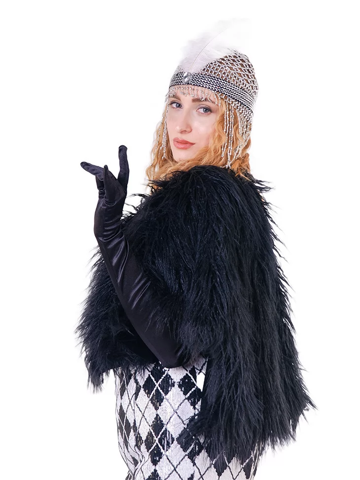 Епатажний, сміливий і дуже кінематографічний образ, натхненний атмосферою джазових вечірок та богемного життя 1920-х років. Контрастна сукня з геометричним візерунком одразу привертає увагу, а хутряна накидка й довгі рукавички додають образу драматизму та шарму епохи. Це яскравий вибір для оренди карнавальних костюмів із характером справжньої флапер-діви.