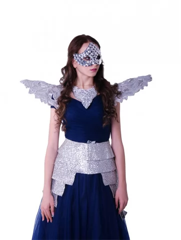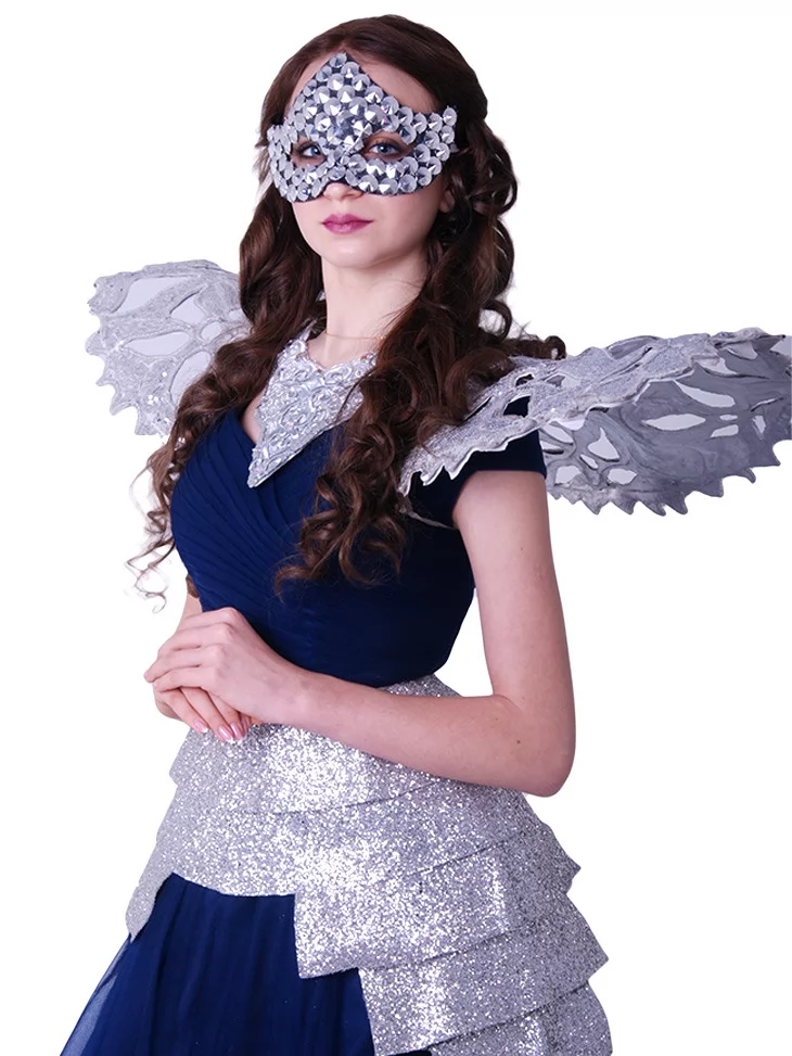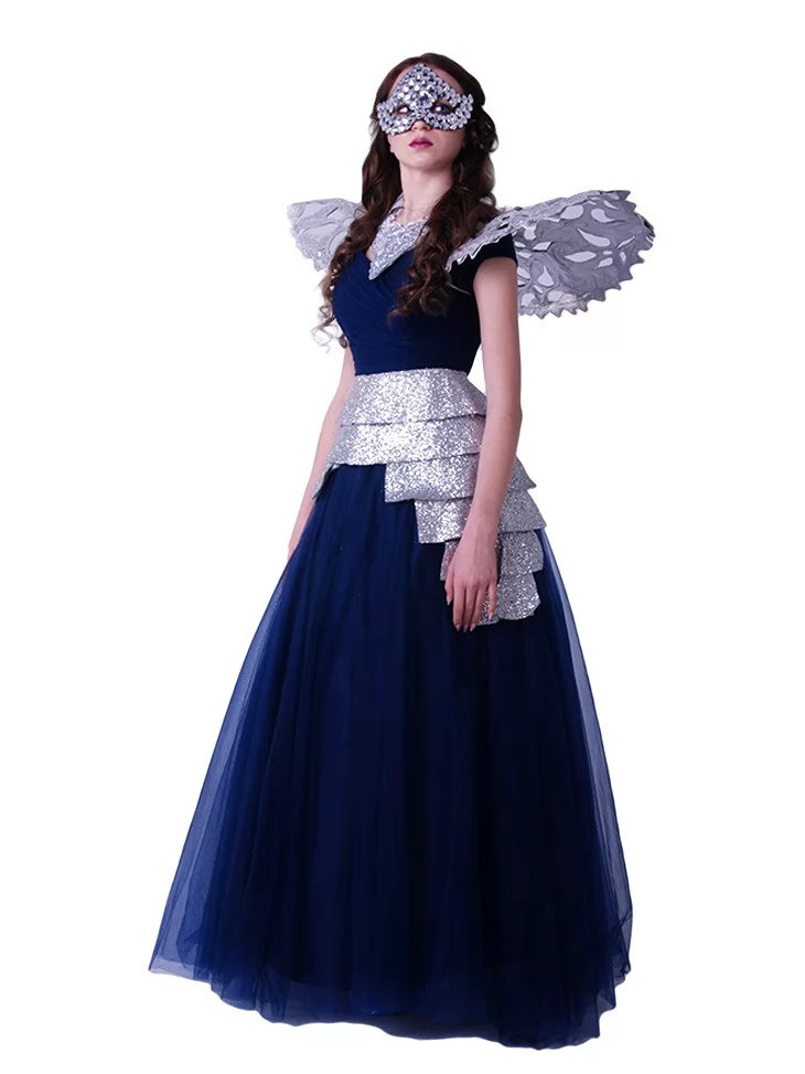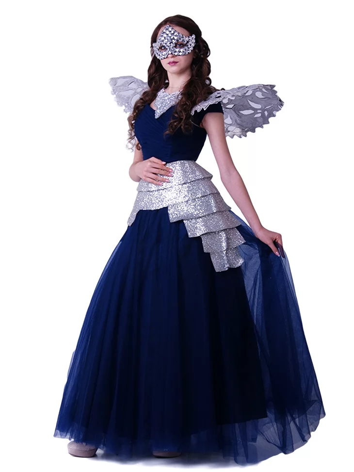 Костюм «Срібляста Леді Карнавалу» — це ефектний образ у стилі венеціанського балу. Завдяки поєднанню блискучого срібла та глибокого синього, він виглядає загадково та елегантно. Ідеальне рішення для тих, хто шукає оренду карнавальних костюмів для неповторного вечора.