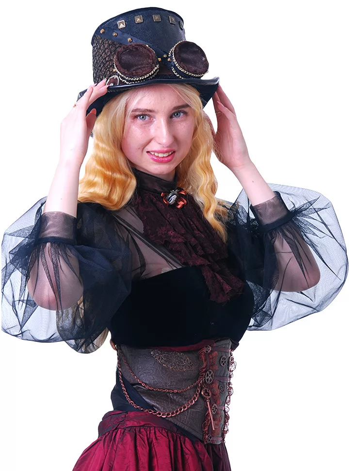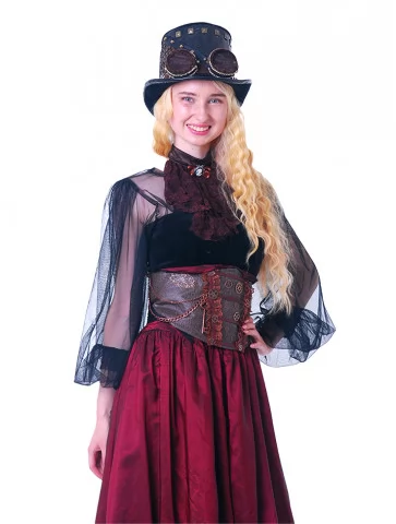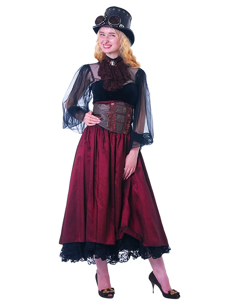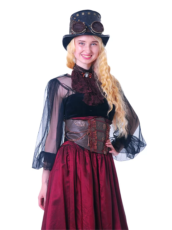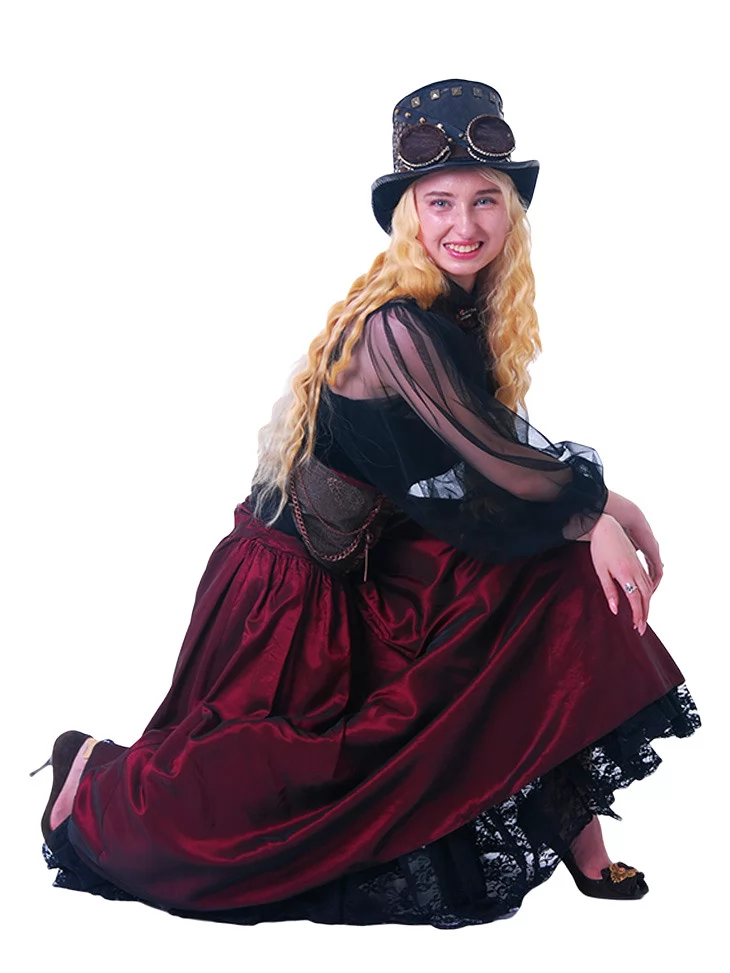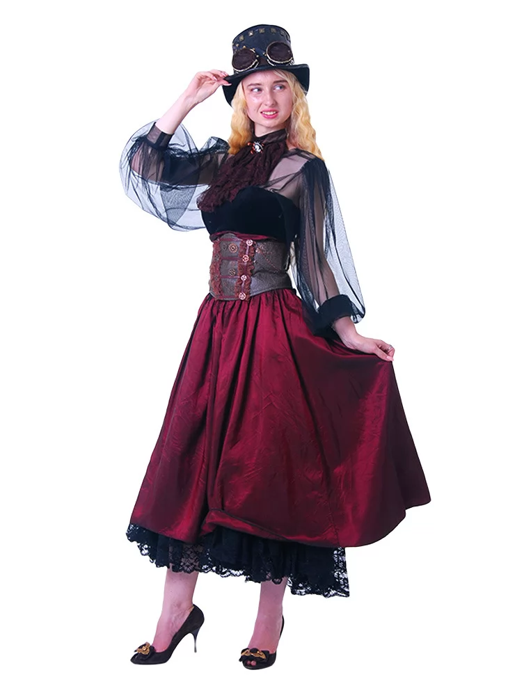 Цей образ створено для справжніх леді майбутнього — яскравих, сміливих і загадкових. Якщо вам потрібна оренда карнавальних костюмів, костюм Стімпанк-Леді у бордовому стане вашим улюбленим вибором. Завдяки нашому сервісу прокат карнавальних костюмів, ви легко втілите яскравий образ на будь-якому святі.