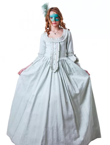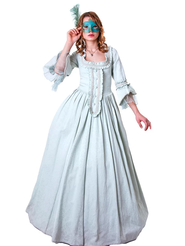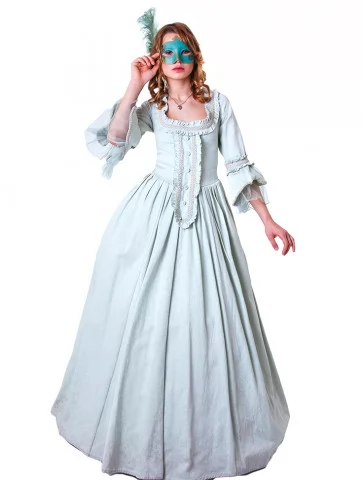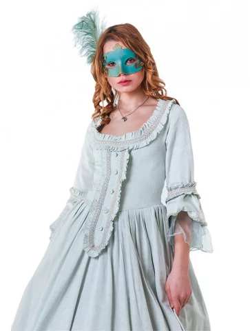Цей костюм – витончене втілення епохи бароко та венеціанського карнавалу. Образ виглядає розкішно й водночас стримано, ідеально підходить для свят, фотосесій та театральних подій. Ніжний бірюзовий колір додає легкості та елегантності, а маска створює відчуття загадковості.