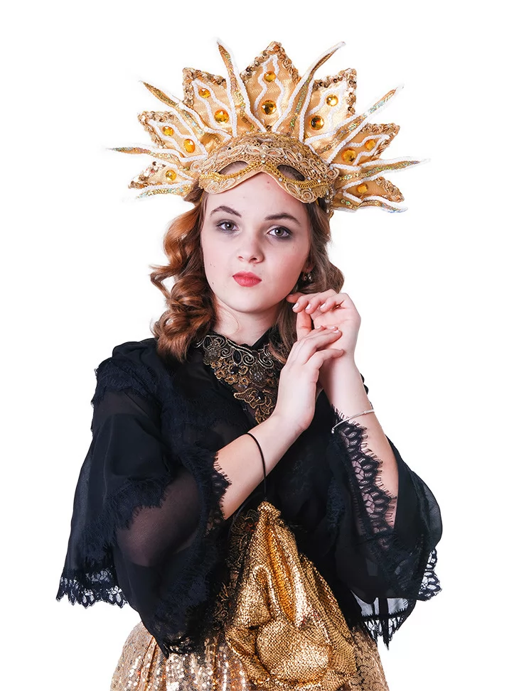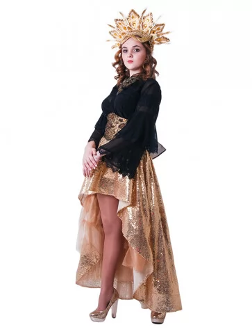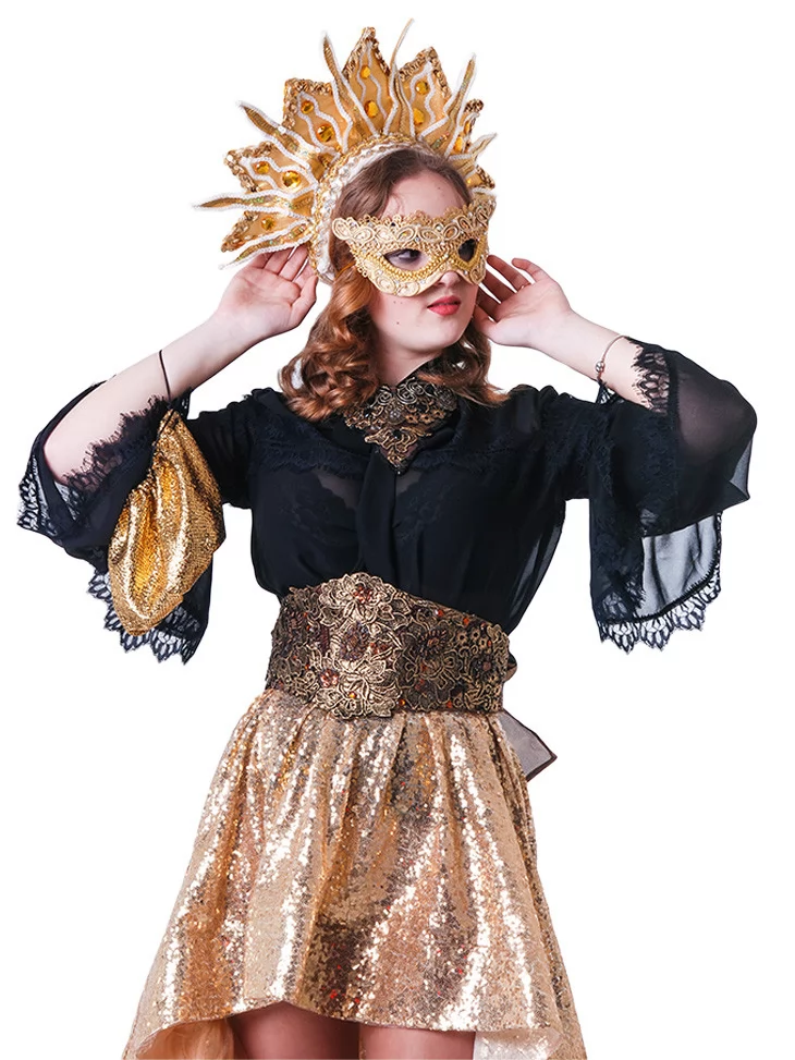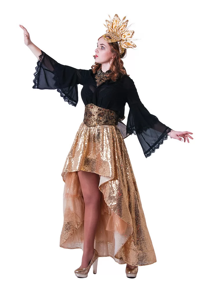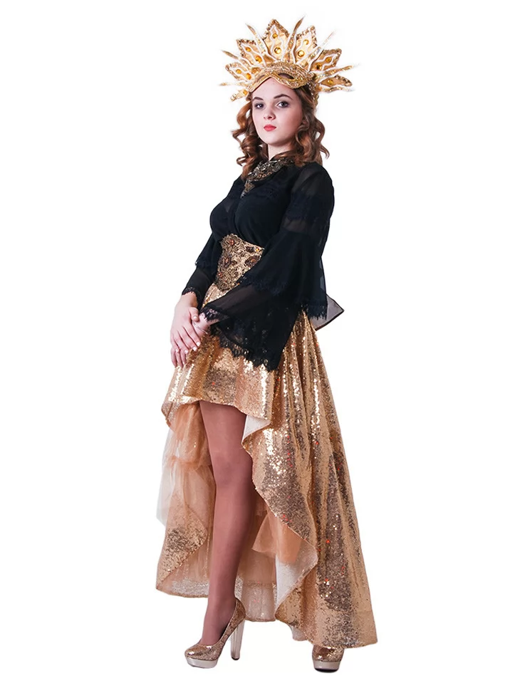 Костюм «Сонячна Королева» — розкішний та яскравий образ, що поєднує загадковість темної фатальної дами та блиск золотої богині