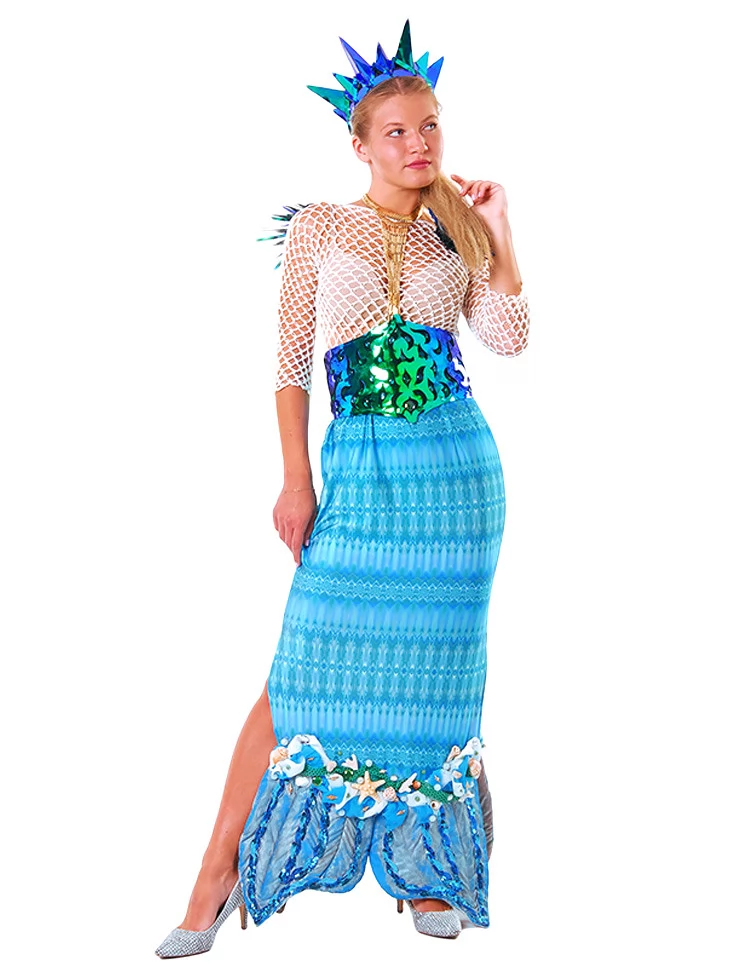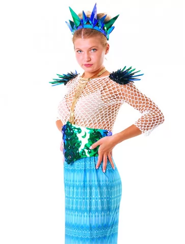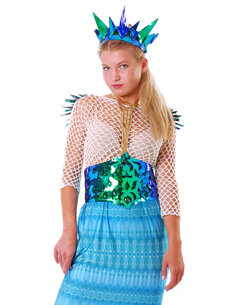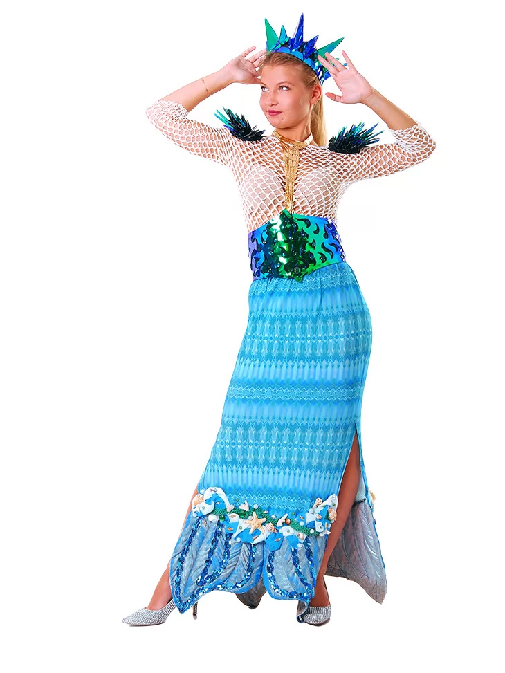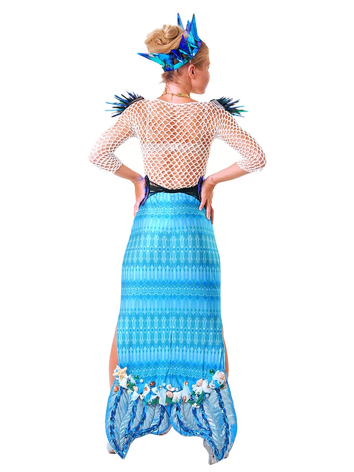 Цей чарівний образ натхненний глибиною океану та мерехтінням морської води. Поєднання сітчастого верху, блискучого корсета з лускатим ефектом і довгої спідниці з декором у вигляді мушель та морських зірок створює відчуття справжньої казкової русалки. Образ виглядає яскраво, сценічно та дуже фотогенічно — ідеальний варіант для оренда карнавальних костюмів на тематичні вечірки, шоу-програми, фотосесії та фестивалі.