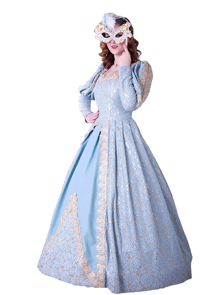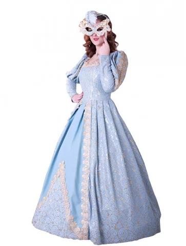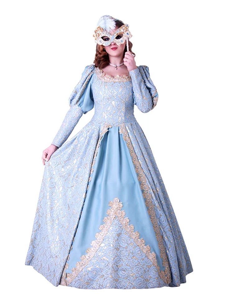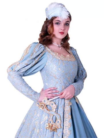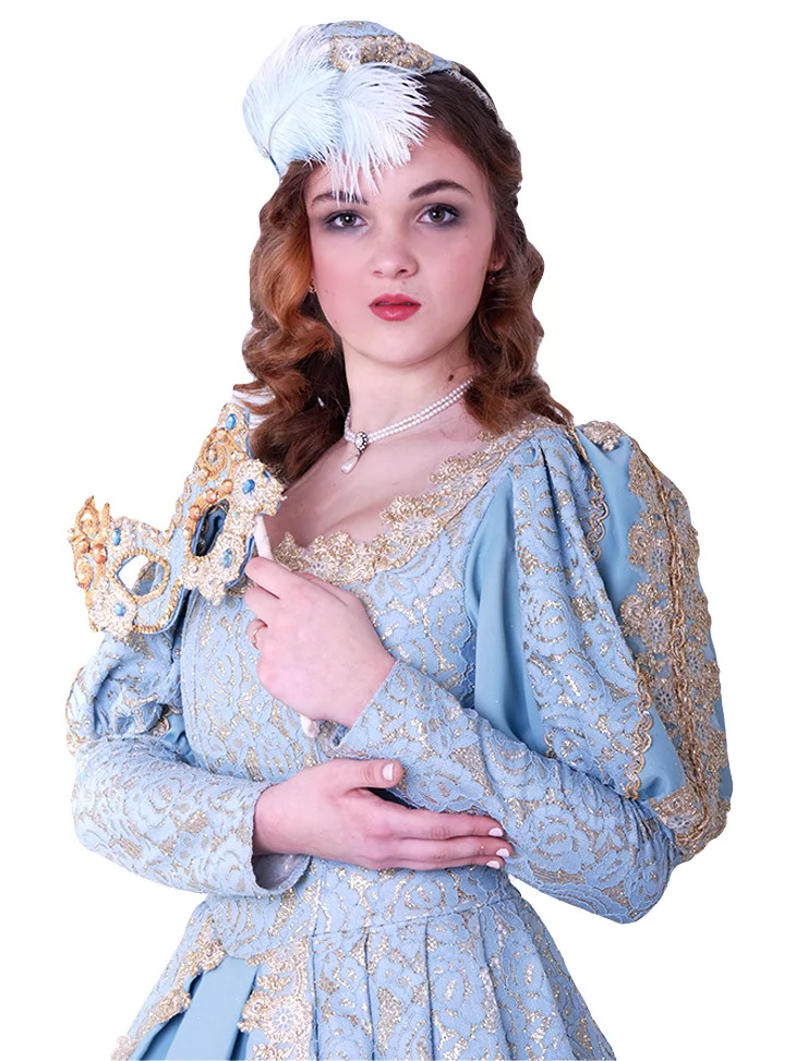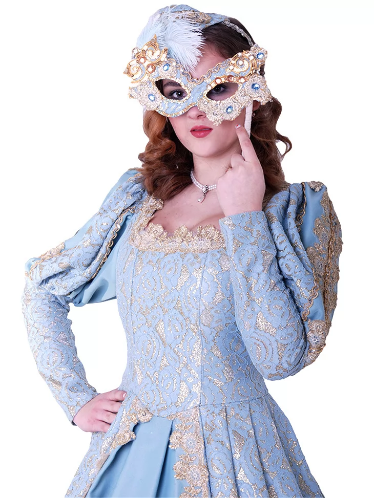 Костюм «Блакитна Маркіза» — вишукана ода епохі бароко та загадковості венеціанських балів. Витончена сукня небесно-блакитного кольору з розкішною золотою вишивкою вражає своїм королівським силуетом. Доповнює образ маска, інкрустована блискучим декором, — ідеальний штрих для справжньої дами карнавалу. Цей образ доступний для оренди карнавальних костюмів, щоб зробити будь-яку подію по-справжньому чарівною.