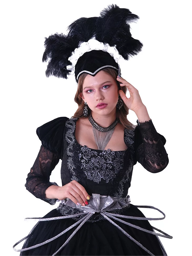 Костюм «Темна Графиня Карнавалу» — це втілення аристократичної загадковості та венеціанської розкоші. Ефектна сукня з глибоким чорним оксамитом, вишитими візерунками та масивним головним убором з пір’ям створює образ справжньої героїні з маскараду XVII-XVIII століття. Вбрання чудово підійде для балу-маскараду, вечірки в стилі венеціанського карнавалу, театрального перформансу або фотосесії.