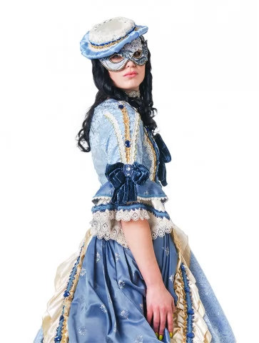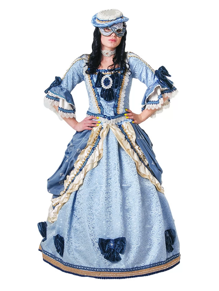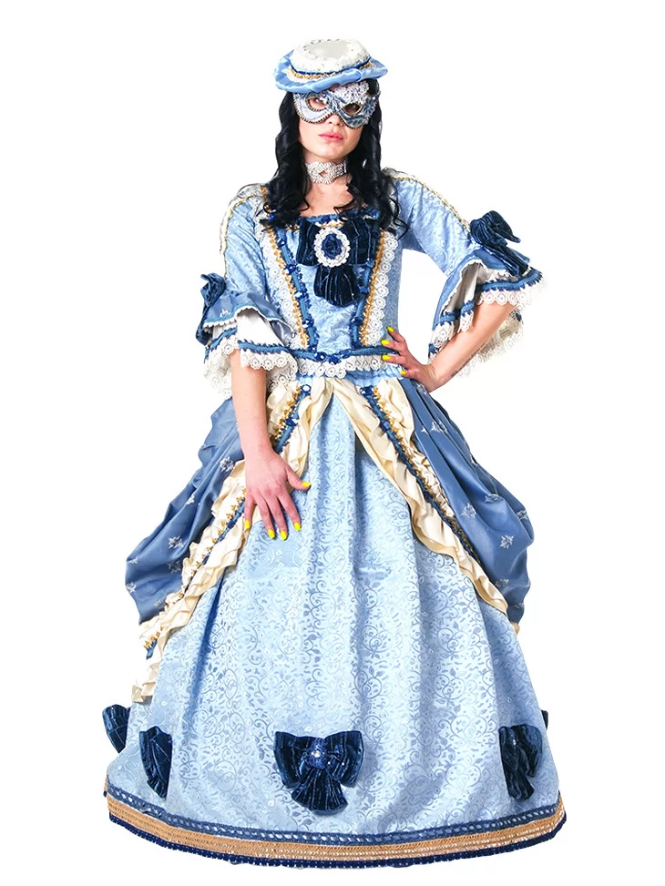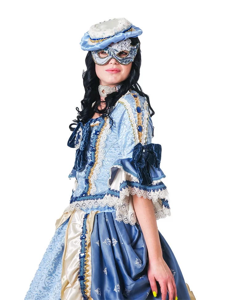 Костюм «Загадкова Королева» — елегантний та розкішний образ, що поєднує в собі урочистість венеціанських балів і грайливу святкову атмосферу. Пишна багатошарова сукня кольору небесної блакиті оздоблена декоративними стрічками, оксамитовими бантами та мереживом, що створює враження карнавальної величності. Завершує образ капелюшок у тому ж стилі та витончена маска. Цей образ — ідеальний варіант для оренди карнавальних костюмів, якщо ви хочете виглядати яскраво, шляхетно й святково.