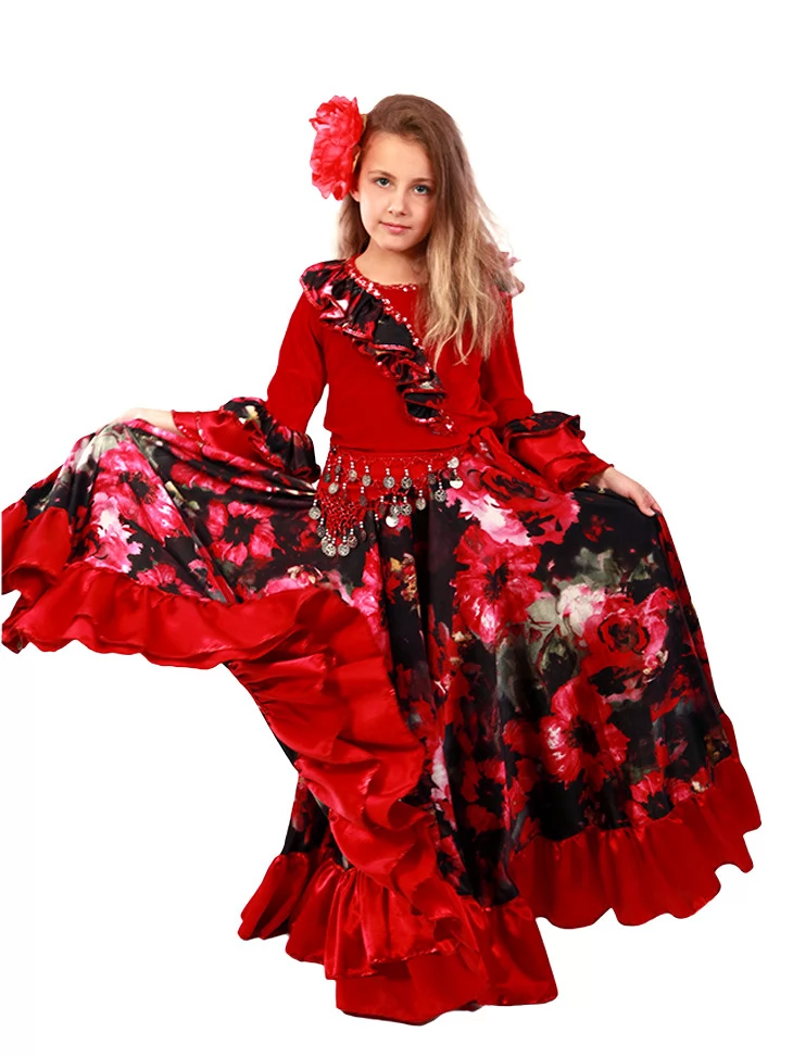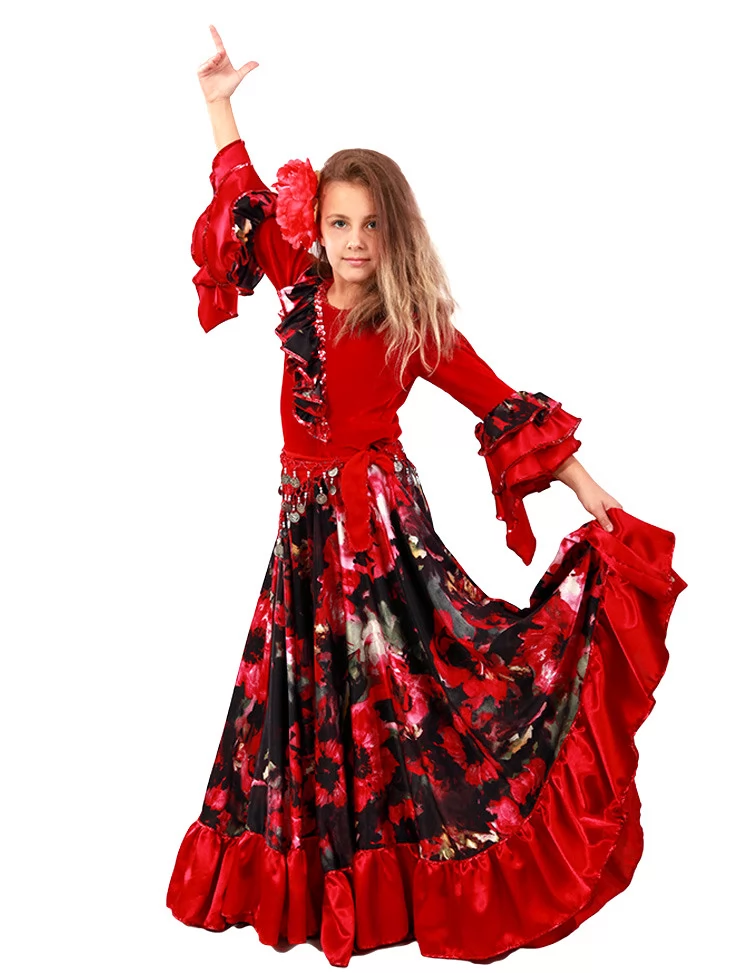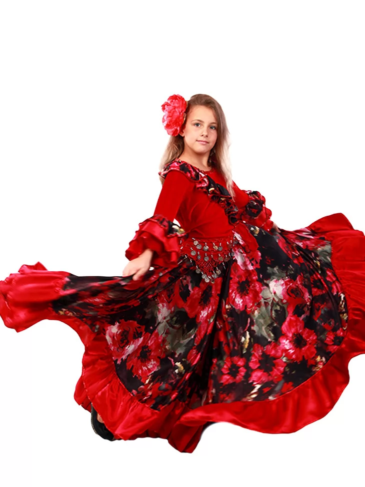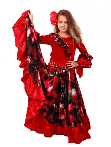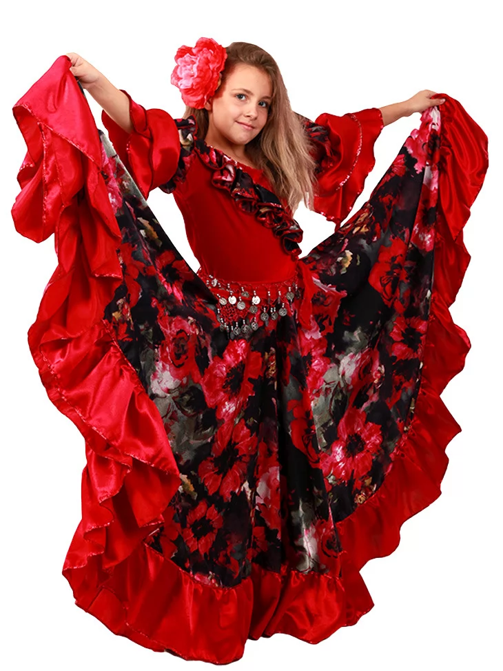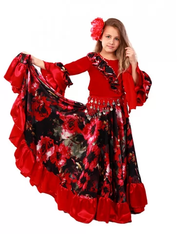 Яскравий, вільний і по-справжньому темпераментний образ, сповнений руху та емоцій. Насичений червоний колір, пишна спідниця з квітковим візерунком і динамічний силует створюють атмосферу танцю, музики та святкового настрою. Це вдалий вибір для оренди карнавальних костюмів на виступи, концерти й тематичні події.