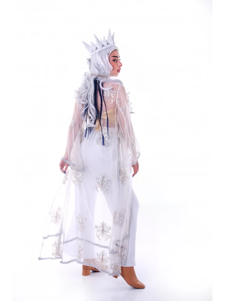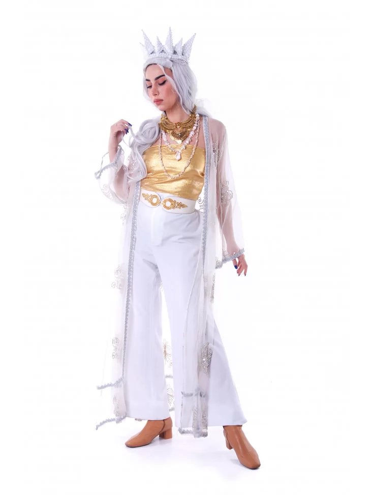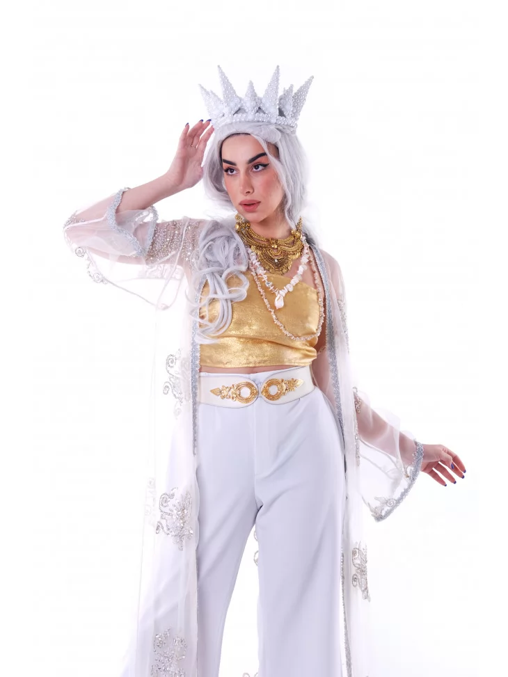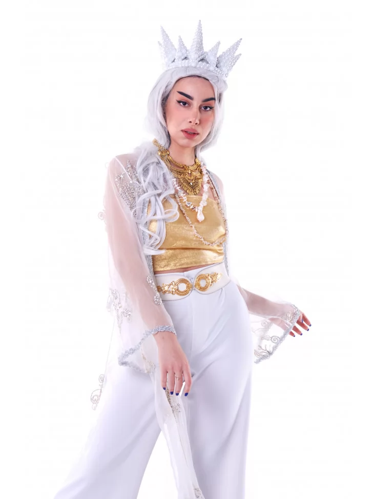 Костюм «Сонячна Верховна» — це образ богині світла, лідерки духовного племені, яка випромінює силу, спокій і стиль. Він поєднує золото, білизну та прозорі текстури в образ, що одночасно святковий, футуристичний і глибоко символічний. Ідеальний вибір для фестивалю Burning Man, performance-шоу або арт-фотосесії. Образ доступний через оренду карнавальних костюмів.