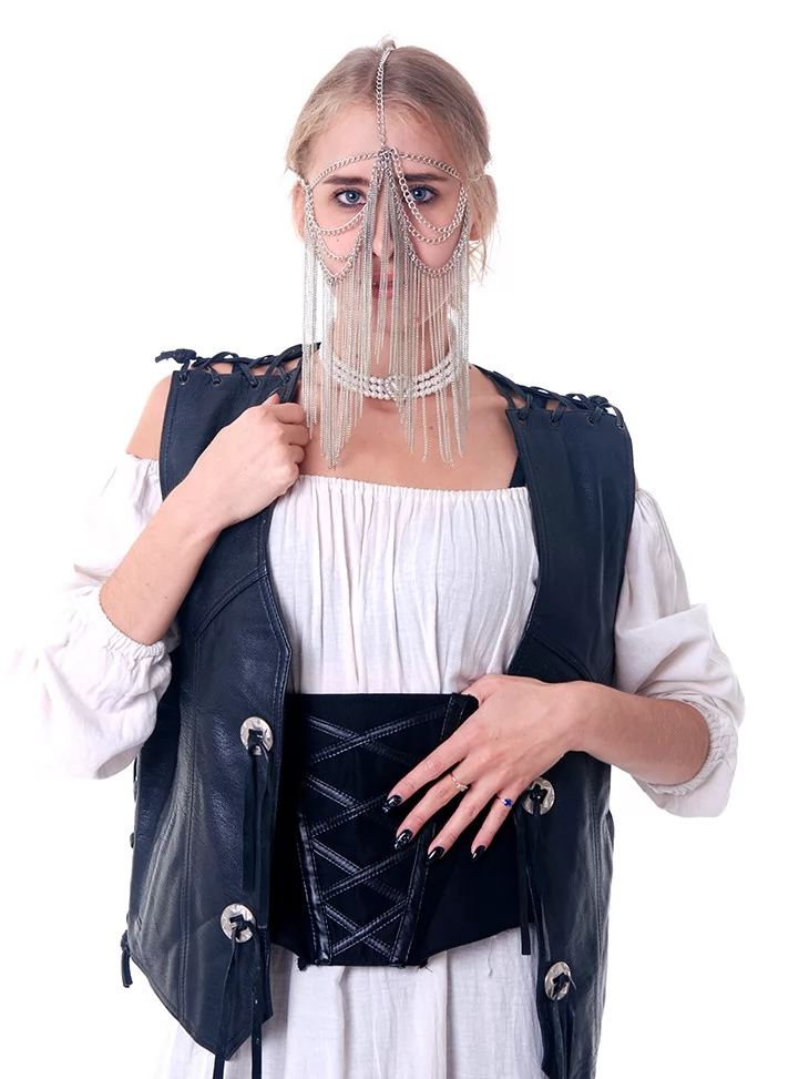 – масивний чокер та металева прикраса на обличчі з ланцюгів — елемент, що привертає погляди