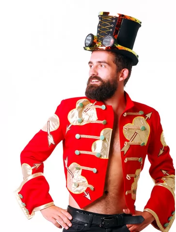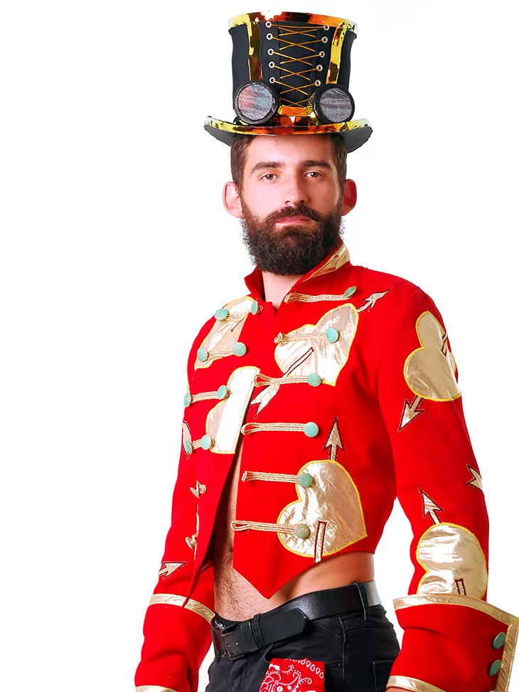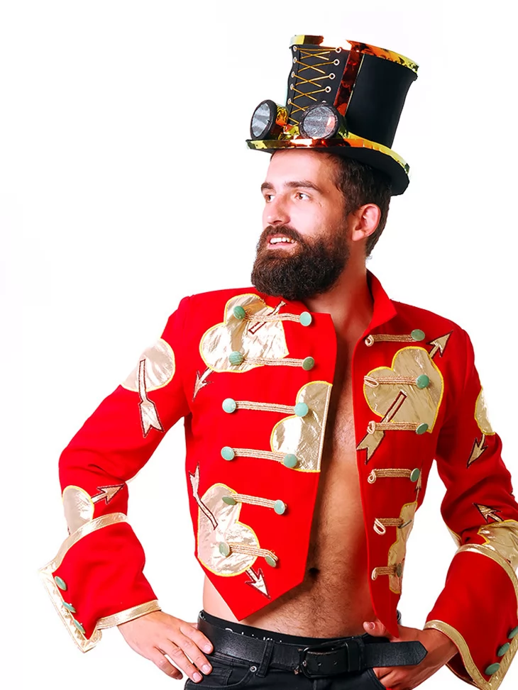 Карнавальний костюм “Паровий Бармен” — це вибух кольору, епатажу і харизми. Унікальний мікс стилю стімпанк із нотками циркового ретро, цей образ не залишить байдужим нікого. Червоний піджак з оригінальним оздобленням, капелюх з декоративними елементами та впевнена постава — створюють справжній сценічний ефект.