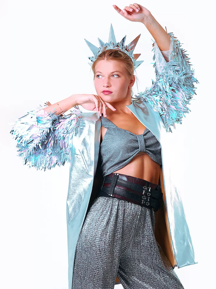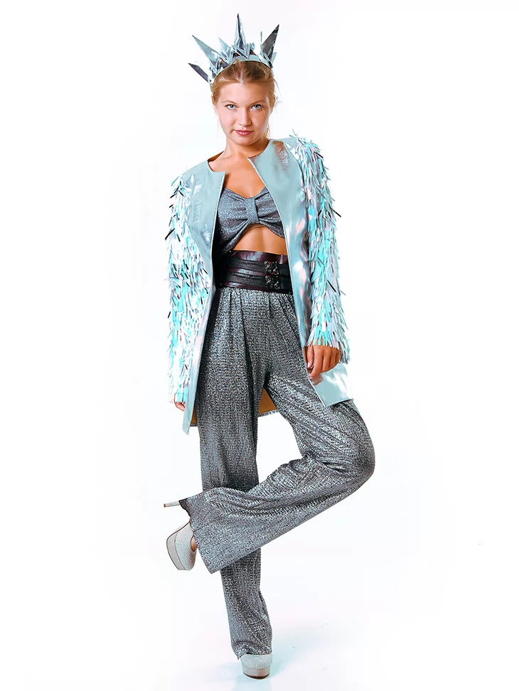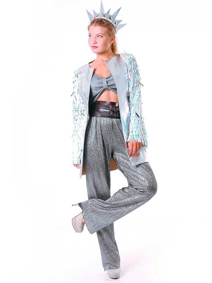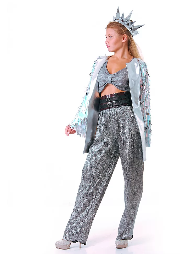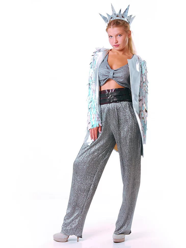 Костюм «Срібна Бернінг Леді з металевим сяйвом» — це естетика космічного глему, зухвалості та електричного блиску. Комплект із сяючої тканини ефектно підкреслює фігуру, а прозорий плащ з декором нагадує про міжгалактичні подорожі та нічні пригоди посеред пустелі. Корона у формі срібних шипів — сміливий акцент для справжньої королеви фестивалю. Цей образ створений для тих, хто шукає неперевершений стиль через оренду карнавальних костюмів у форматі Burning Man.