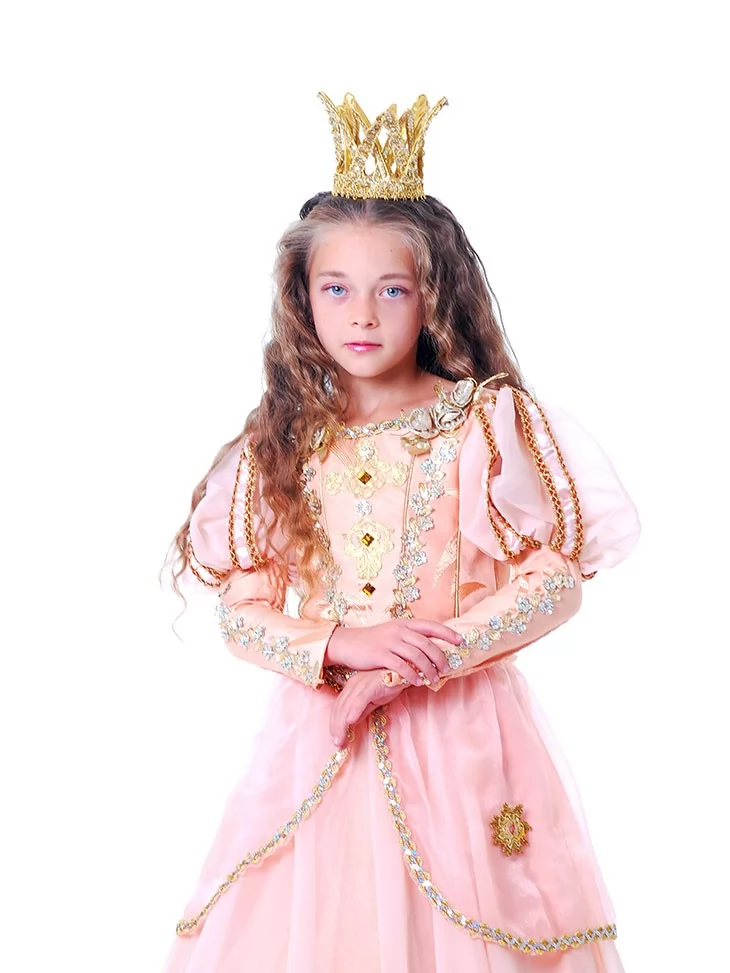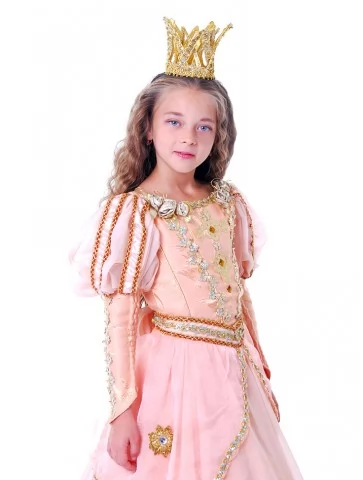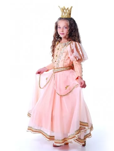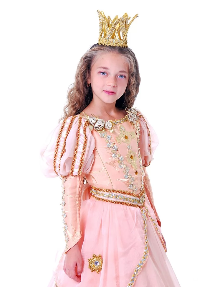 Костюм принцессы включает в себя длинное платье декорированное золотой тесьмой.