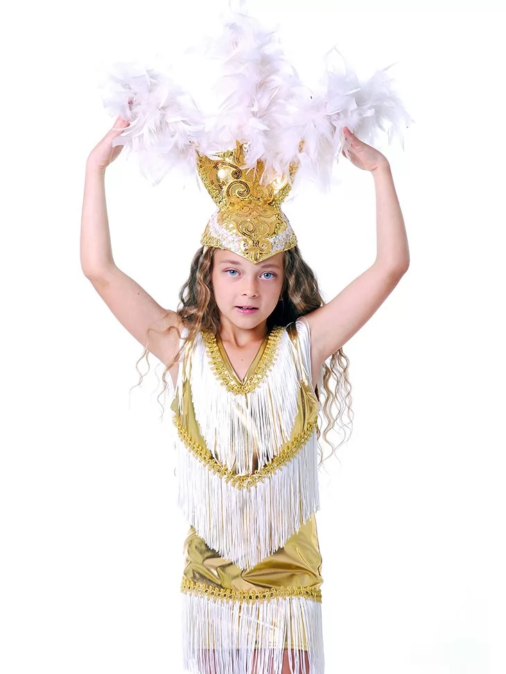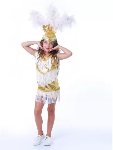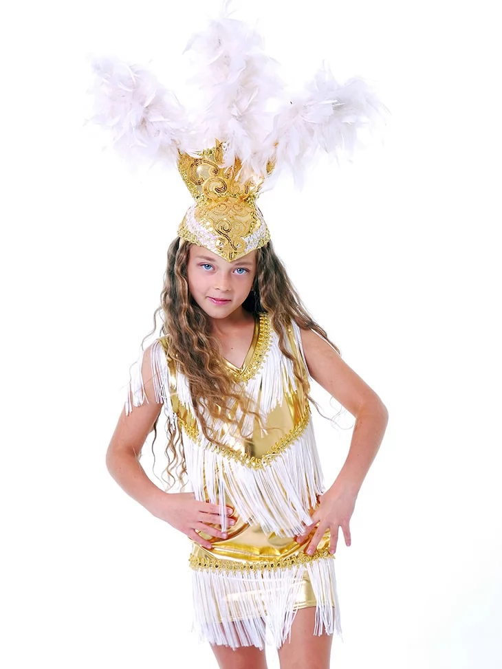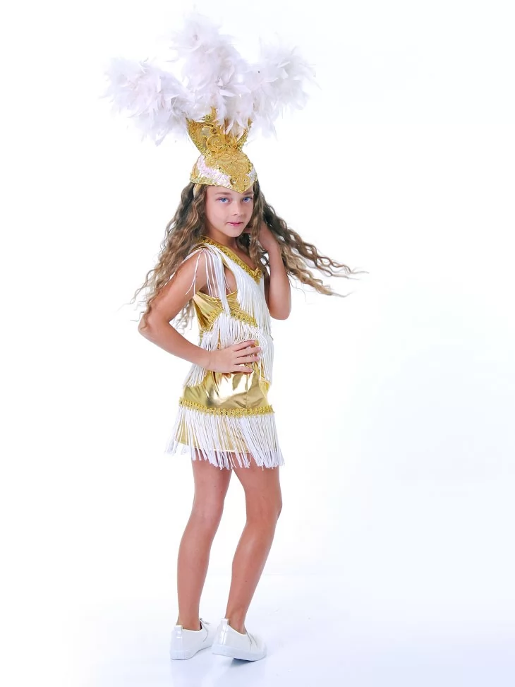 Яскравий, святковий образ, що передає атмосферу бразильського карнавалу, танцю та сонячної енергії. Золото-біла гама, блискучі деталі та ефектна бахрома створюють відчуття сцени, музики й постійного руху. Це ідеальний вибір для оренда карнавальних костюмів, коли потрібен максимально виразний і життєрадісний образ.
