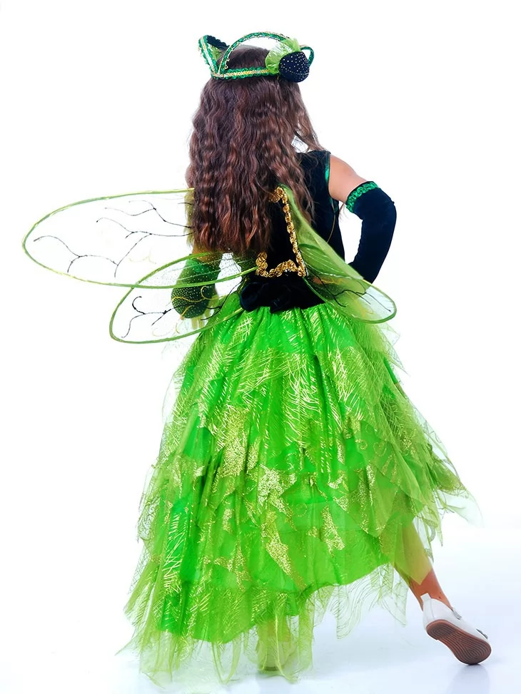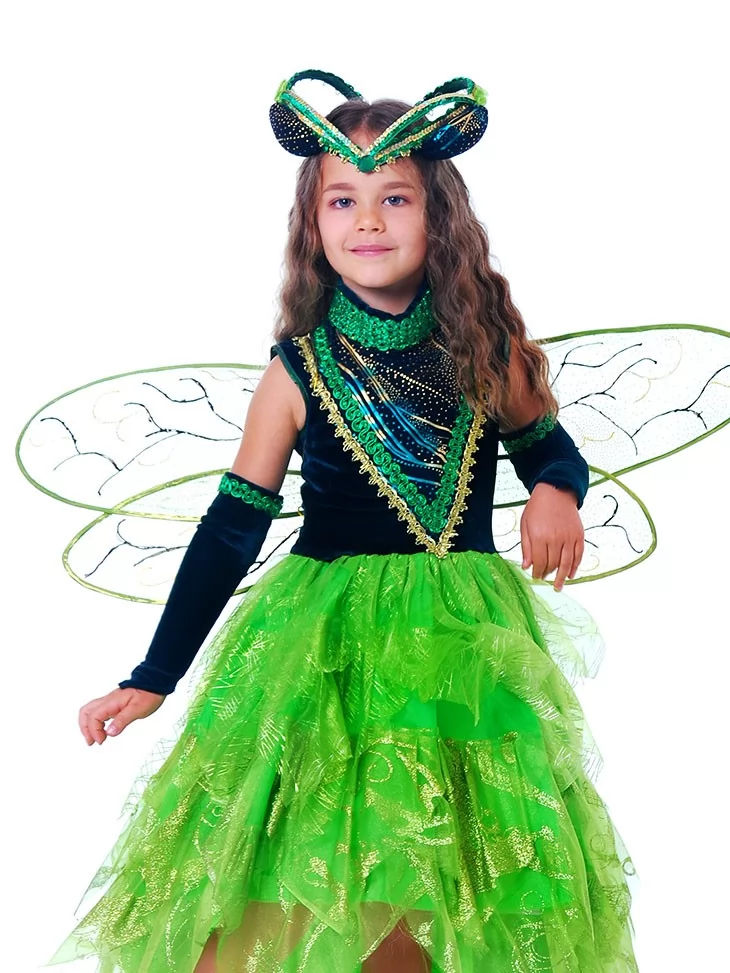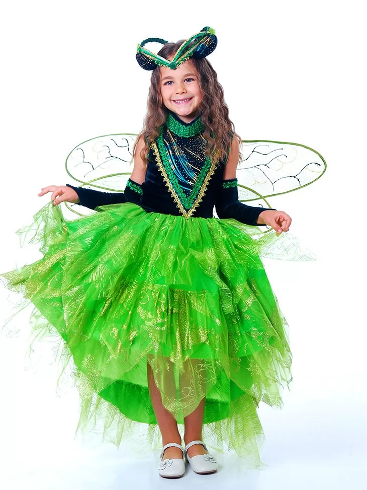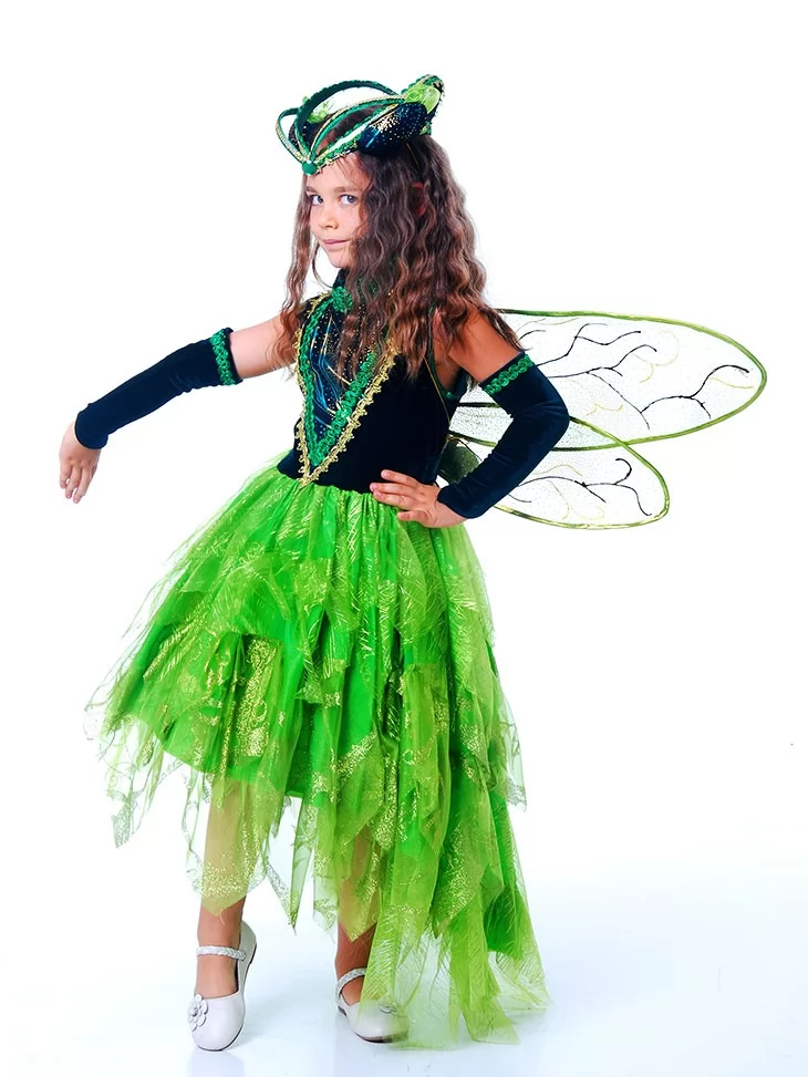 Легкий, яскравий та сповнений природної магії образ переносить у світ сонячних галявин, де мерехтять крила казкових комах і панує літня радість. Насичено-зелена пишна спідниця з золотистими переливами виглядає повітряно та святково, а темний корсет із декоративною обробкою підкреслює витонченість силуету. Прозорі крильця створюють ефект справжньої бабки у польоті, а фантазійний головний убір додає образу завершеності. Цей костюм чудово підходить для оренди карнавальних костюмів на дитячі свята, вистави та казкові фотосесії.