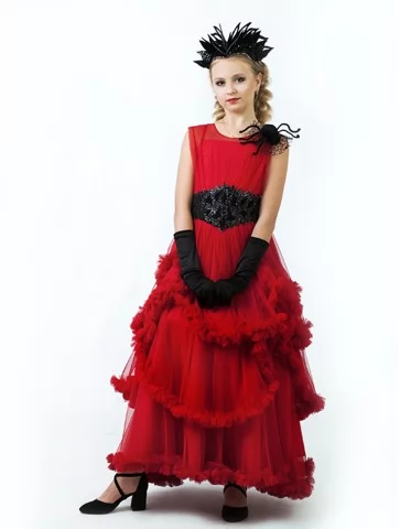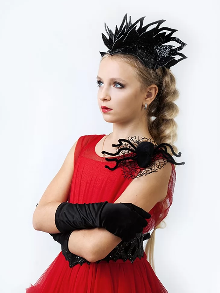 Розкішний та звабливий образ із ноткою темної інтриги. Ефектна червона сукня з багатошаровою фатіновою спідницею створює величний силует, що привертає увагу з першого кроку. Контрастний чорний пояс із мереживом підкреслює талію та додає готичної елегантності. Декоративний павук на плечі стає виразним акцентом образу, а стильна чорна корона завершує перевтілення у загадкову володарку павутинних балів. Ідеальний вибір для оренди карнавальних костюмів на Хелловін, тематичні вечірки або фотосесії.