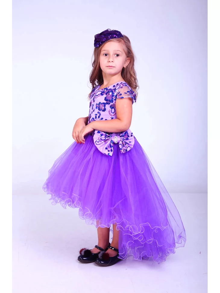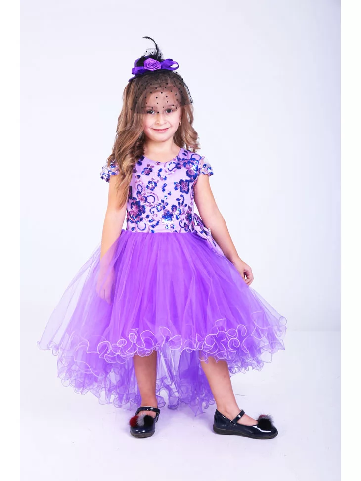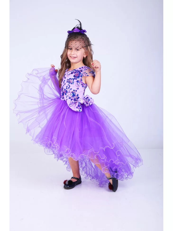 Яскрава святкова сукня у насиченому фіолетовому кольорі створює ефектний образ маленької модниці та одразу привертає увагу блиском і легкістю. Цей варіант чудово підходить для оренди карнавальних костюмів на дні народження, фотосесії, виступи й урочисті події. Верх сукні оздоблений паєтками з квітковим візерунком, які красиво переливаються на світлі, а пишна фатинова спідниця додає образу об’єму, ніжності та святкового настрою.