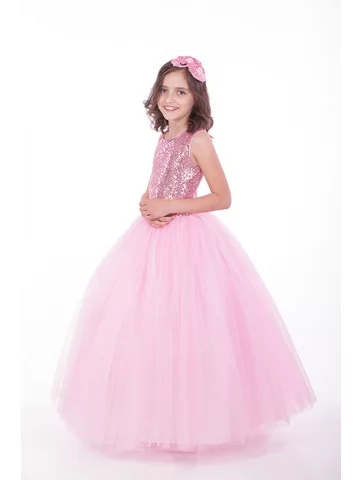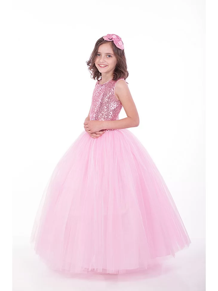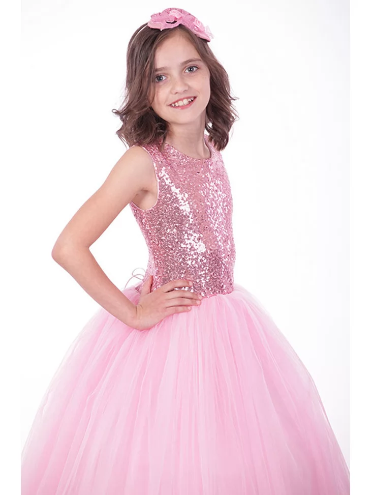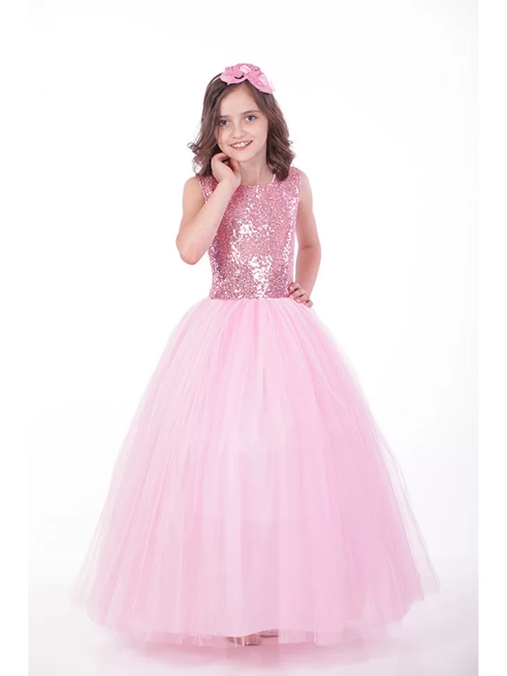 Розкішний і водночас ніжний образ юної леді, що поєднує святковий блиск і повітряну легкість у кожній деталі. Сяючий верх, оздоблений дрібними блискітками, красиво переливається при світлі, а пишна багатошарова тюлева спідниця створює ефект справжньої бальної сукні принцеси. Образ виглядає урочисто, елегантно й дуже фотогенічно — ідеальний варіант для оренди карнавальних костюмів на випускні, бали, фотосесії та святкові події.