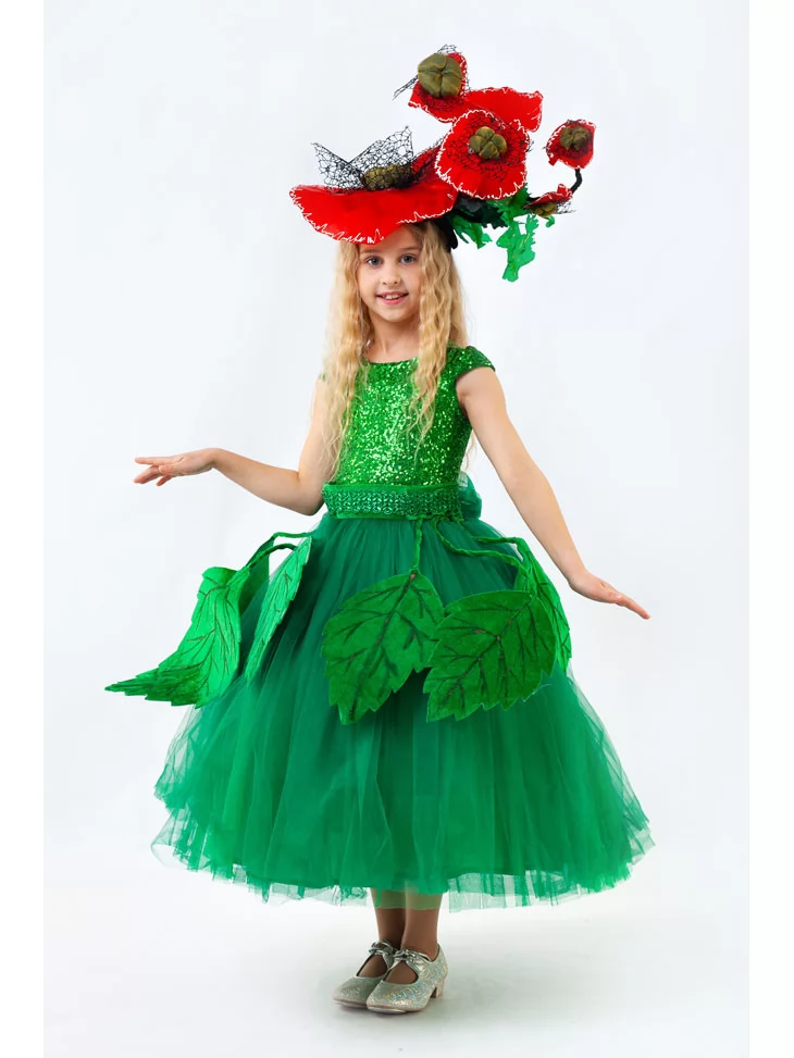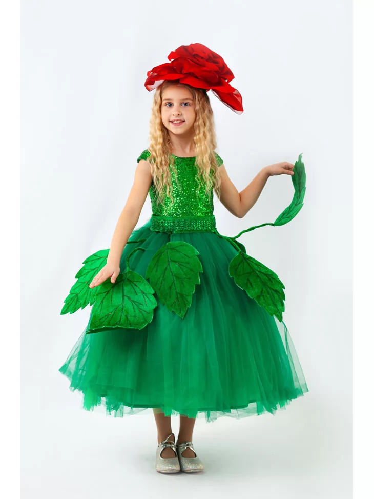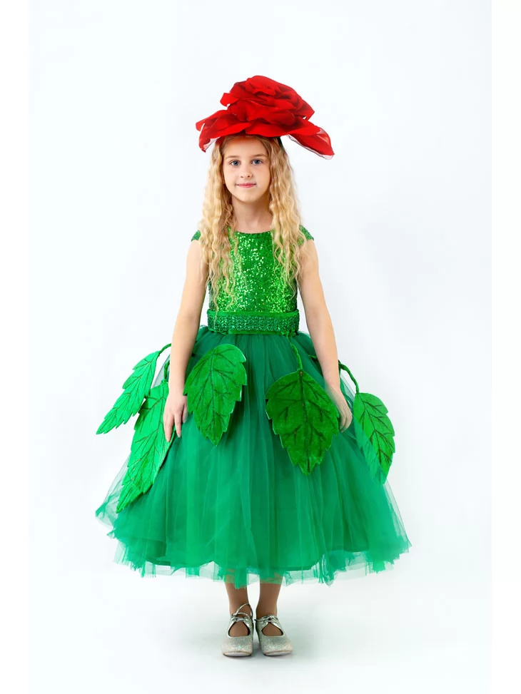 Витончений квітковий образ, у якому поєднуються розкіш зеленої природи та королівська краса червоної троянди. Сяюча смарагдова сукня з пишною фатіновою спідницею виглядає мов чарівний сад у розквіті, а великі декоративні листки створюють ефект живої квітки. Об’ємна троянда на головному уборі надає образу святкової величі й казкової елегантності. Це чудовий варіант для оренди карнавальних костюмів на весняні свята, виступи та фотосесії.