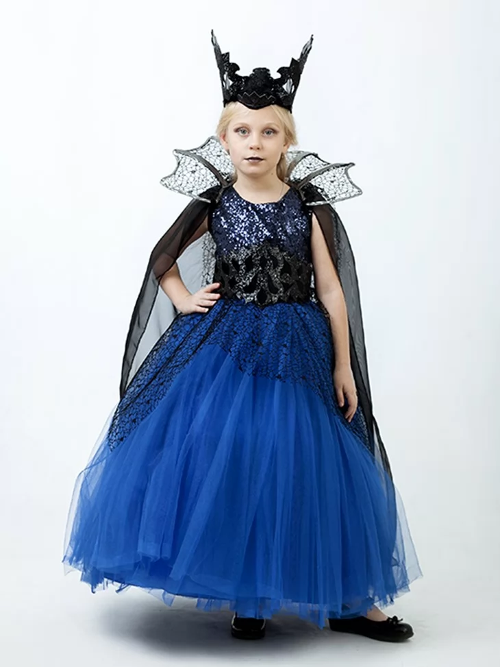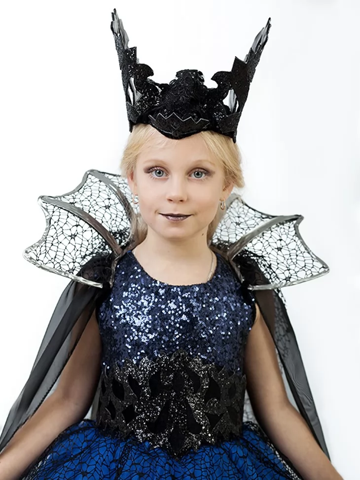 Величний образ із короною та драматичним силуетом для магічної ночі. Глибокий синій відтінок сукні в поєднанні з чорними мереживними акцентами створює атмосферу загадковості та благородства. Блискучий верх із паєтками красиво переливається при світлі, а пишна фатінова спідниця додає образу розкішного об’єму. Декоративний комір із павутинним ефектом та легка чорна накидка підсилюють театральність. Витончена корона завершує перевтілення у справжню повелительку темної казки. Ідеальний варіант для оренди карнавальних костюмів на Хелловін, фотосесії та тематичні виступи.