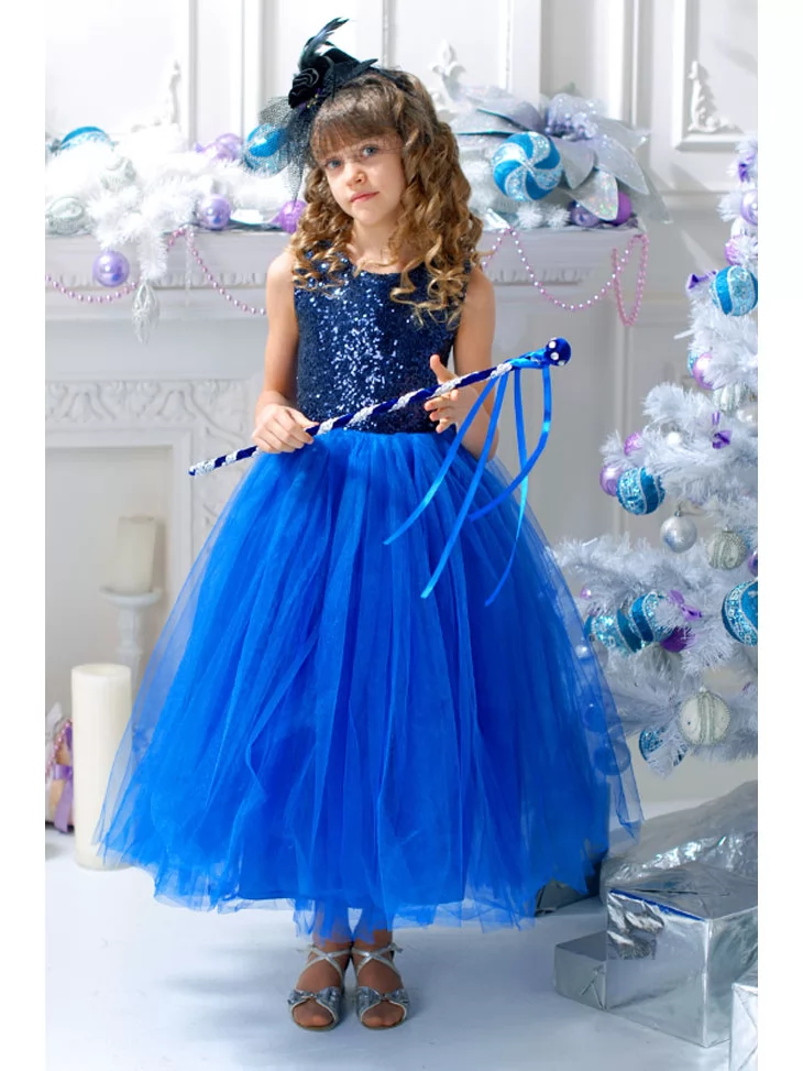 Глибокий, загадковий та елегантний образ, що передає магію темного неба й мерехтіння вечірніх вогників. Насичений синій колір у поєднанні з блискучим верхом створює ефект нічного сяйва. Пишна фатінова спідниця додає образу урочистості, а декоративний капелюшок і чарівна паличка підкреслюють казковий характер героїні. Ідеальний варіант для оренди карнавальних костюмів на новорічні виступи, святкові концерти та фотосесії.