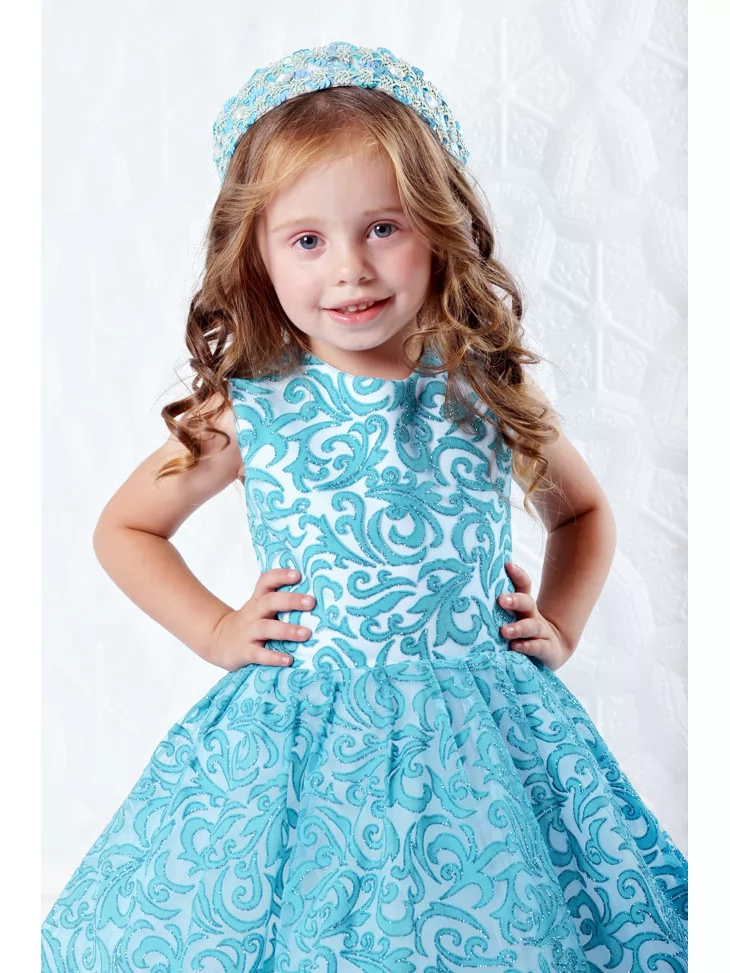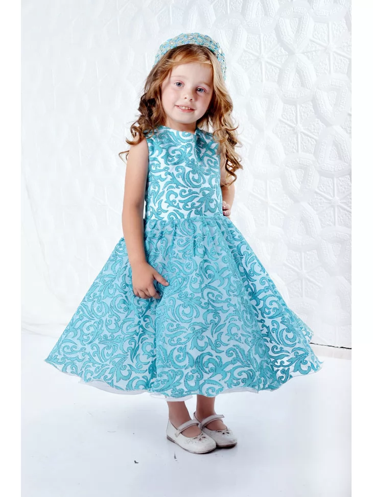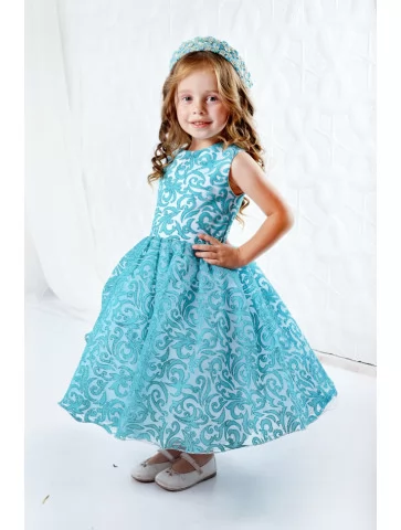 Легка та святкова сукня з ніжним бірюзовим орнаментом створює образ справжньої маленької принцеси — яскравий, повітряний і водночас дуже елегантний. Пишна спідниця красиво розкривається в русі, а витончений візерунок на тканині додає святковості та вишуканості. Такий образ ідеально підходить для оренди карнавальних костюмів на свята, фотосесії, ранки й дні народження, коли хочеться ніжності та казкової атмосфери без зайвих витрат.