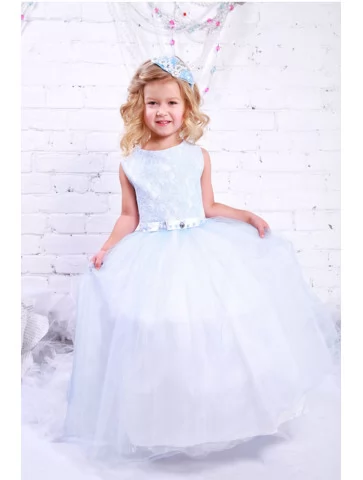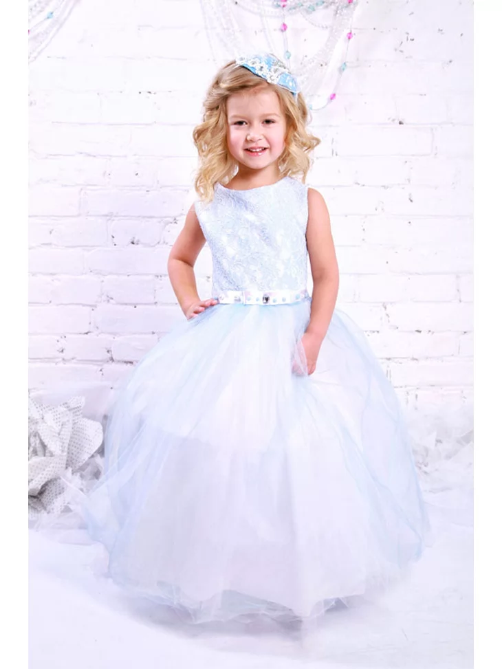 Ніжна святкова сукня у світло-блакитних відтінках створює образ справжньої маленької феї — легкий, повітряний і дуже урочистий. М’який мереживний верх гармонійно поєднується з об’ємною фатиновою спідницею, що красиво переливається в русі та виглядає розкішно на фото. Це чудовий варіант для оренди карнавальних костюмів на ранки, фотосесії, дні народження та святкові виступи.