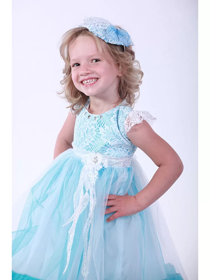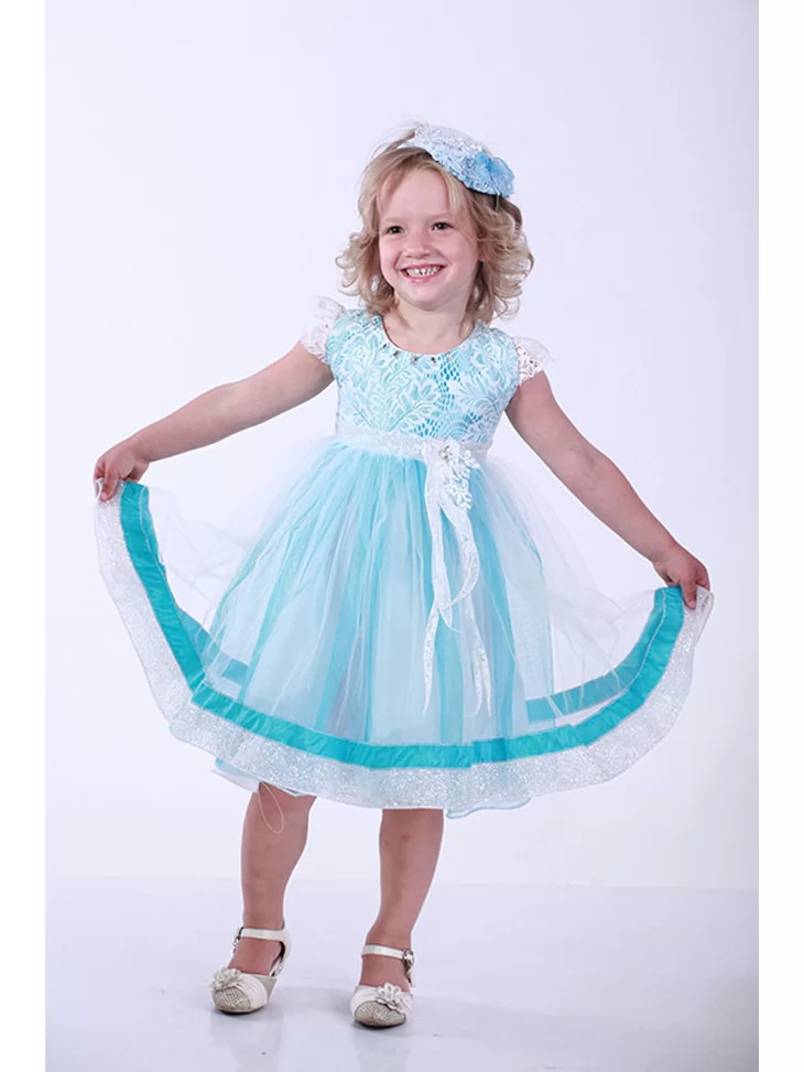 Ніжна, легка сукня створює святковий образ, сповнений радості, повітряності та казкового настрою. Ажурний ліф у блакитному відтінку красиво поєднується з пишною фатиновою спідницею з декоративною облямівкою, що м’яко коливається при кожному кроці. Такий образ ідеально підходить для оренда карнавальних костюмів на дні народження, фотосесії та урочисті події.