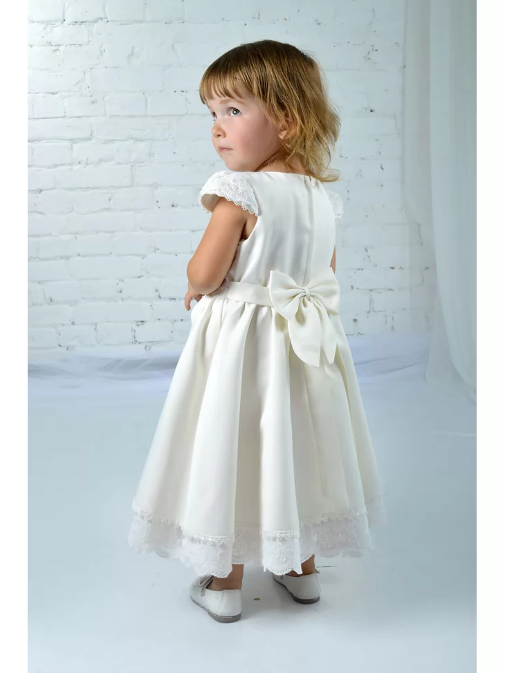Ніжний святковий образ у теплих молочних відтінках виглядає надзвичайно мило та елегантно. Багатошарове мереживо створює об’ємну текстуру, а акуратний бант на талії додає сукні витонченості й казковості. Такий варіант ідеально підходить для оренди карнавальних костюмів на урочистості, фотосесії та дитячі свята, де важлива ніжність образу й комфорт дитини.