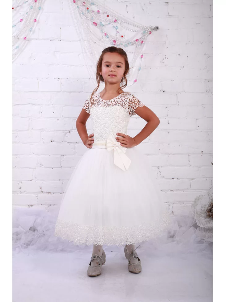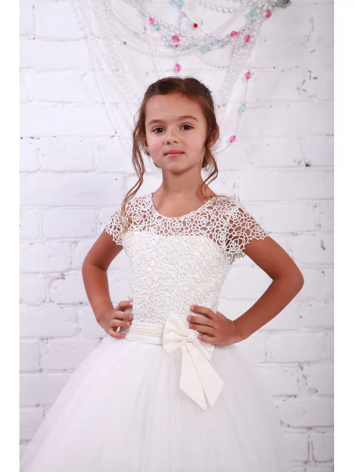 Ніжний святковий образ, що поєднує елегантність, легкість і казкову витонченість. Ця сукня створена для особливих моментів — витончений мереживний ліф з короткими рукавчиками гармонійно переходить у повітряну фатинову спідницю з делікатним блиском по краю. Атласний пояс із бантом красиво підкреслює талію та додає образу святкової завершеності. Чудовий варіант для оренди карнавальних костюмівна урочисті події, фотосесії та дитячі свята.