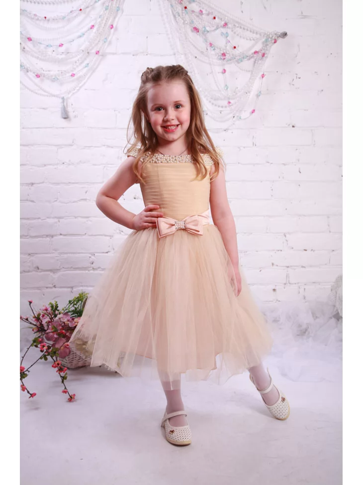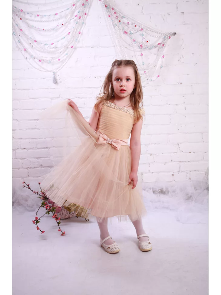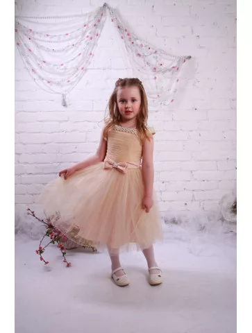 Ніжний, витончений образ маленької леді, що випромінює тепло, легкість і святкову елегантність. Верх сукні у м’якому відтінку шампанського прикрашений делікатним блиском по лінії декольте, а повітряна тюлева спідниця красиво струмує в русі, створюючи справжній бальний силует. Гармонійний бантик на талії додає образу чарівності та завершеності. Це чудовий варіант для оренди карнавальних костюмів на ранки, фотосесії, урочистості та святкові події.