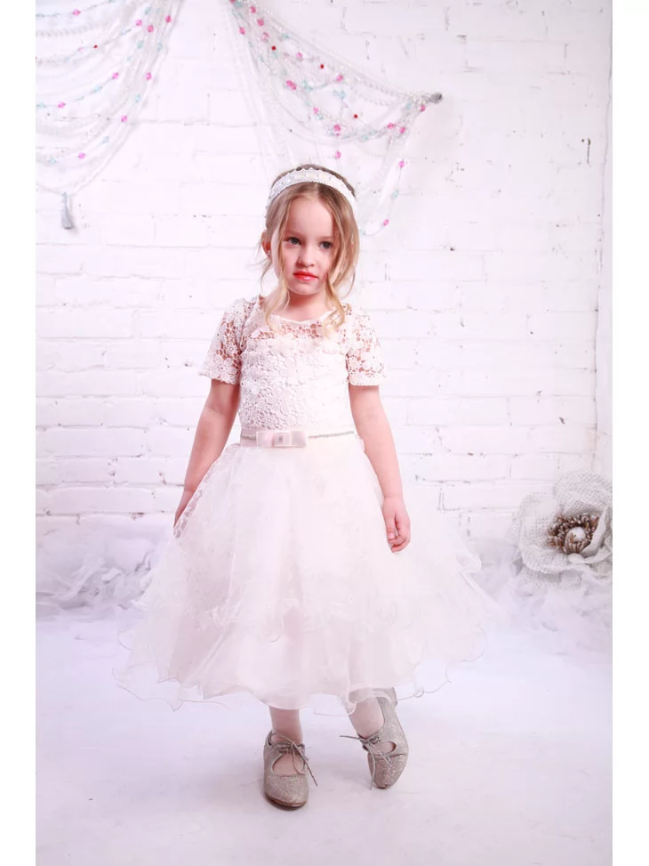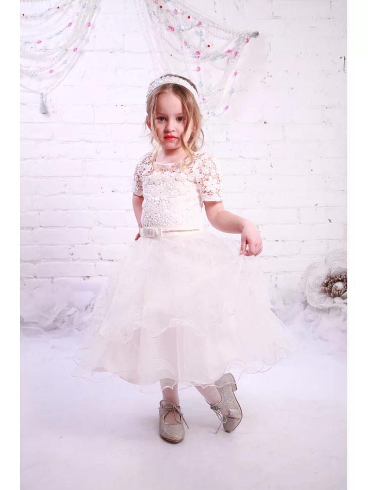 Легка, витончена та дуже ніжна сукня створює образ маленької принцеси з казковою грацією та святковим шармом. Ажурний мереживний верх гармонійно поєднується з багатошаровою напівпрозорою спідницею, яка красиво колихається при кожному русі. Ідеальний варіант для оренди карнавальних костюмів на свята, фотосесії та урочисті події, де важлива ніжність образу й комфорт дитини.