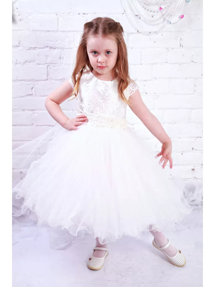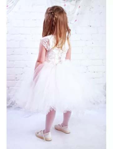 Легка, повітряна та по-справжньому казкова сукня, що огортає дитину ніжністю й створює образ маленької феї зі світу мрій. Акуратний мереживний верх із витонченими візерунками плавно переходить у розкішну багатошарову спідницю з фатину, яка красиво розкривається в русі. Світлий відтінок підкреслює святковість образу та робить його універсальним для багатьох подій. Це чудовий вибір для оренди карнавальних костюмів на ранки, свята, фотосесії та урочисті виступи.