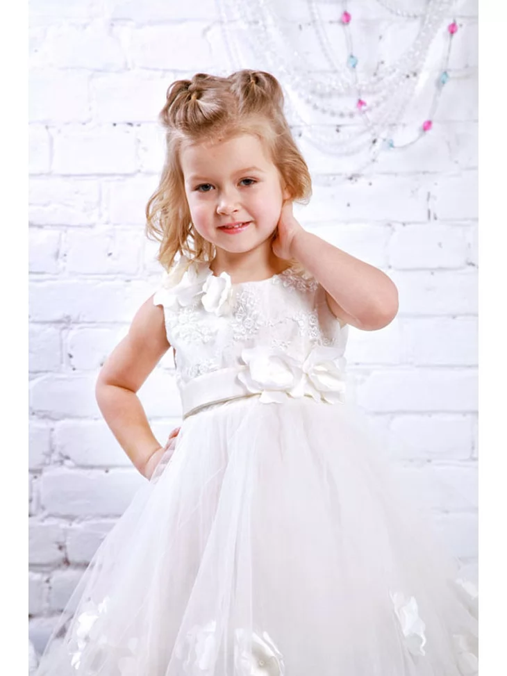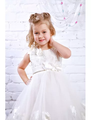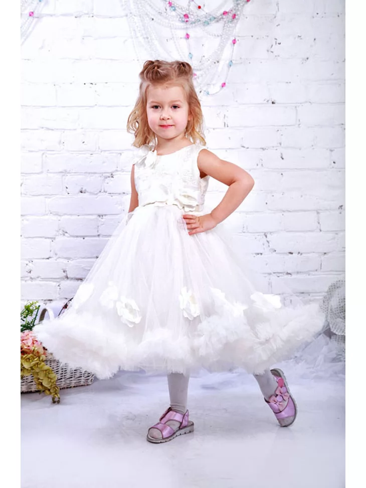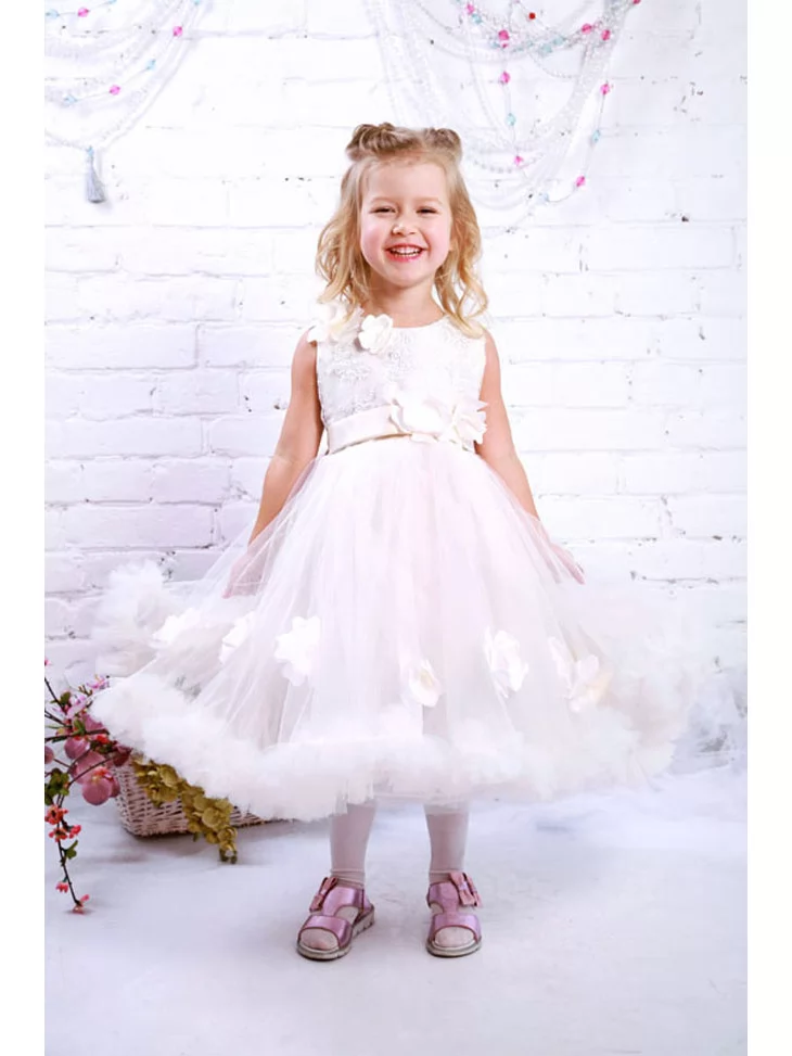 Повітряний святковий образ, мов легка хмаринка, що огортає дитину ніжністю, світлом і справжньою казковою атмосферою. М’який мереживний верх гармонійно поєднується з пишною фатиновою спідницею, прикрашеною об’ємними квітковими елементами, які створюють ефект невагомості та розкоші. Ця сукня виглядає урочисто, але водночас легко й комфортно — ідеальний вибір для оренди карнавальних костюмів на свята, фотосесії, ранки та особливі події.