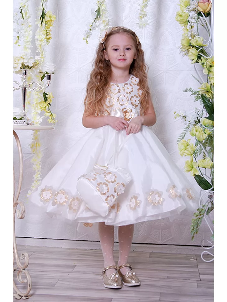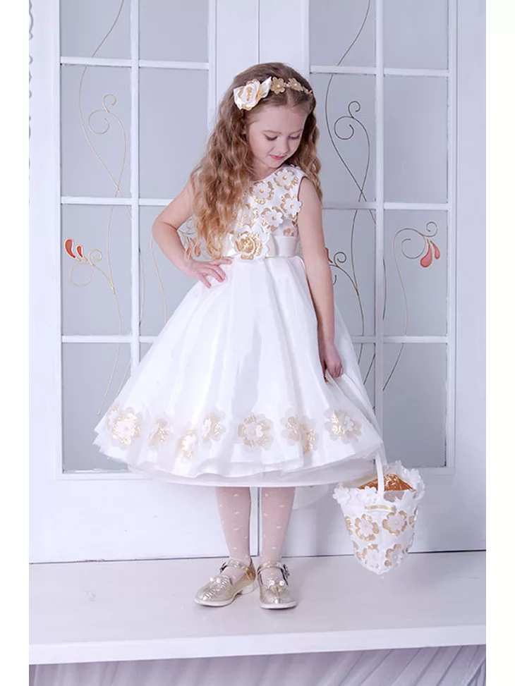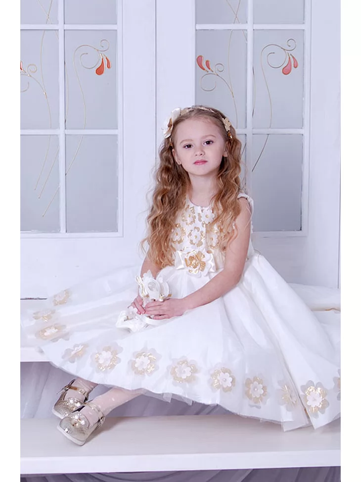 Святковий образ, що поєднує ніжність білого кольору з розкішним золотим декором. Верх сукні прикрашений вишуканими квітковими елементами з легким блиском, які гармонійно переходять у повітряну багатошарову спідницю. Такий силует виглядає урочисто й водночас дуже легко, створюючи ефект справжньої маленької принцеси. Чудовий вибір для оренди карнавальних костюмів на фотосесії, свята та виступи.