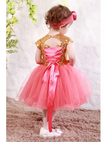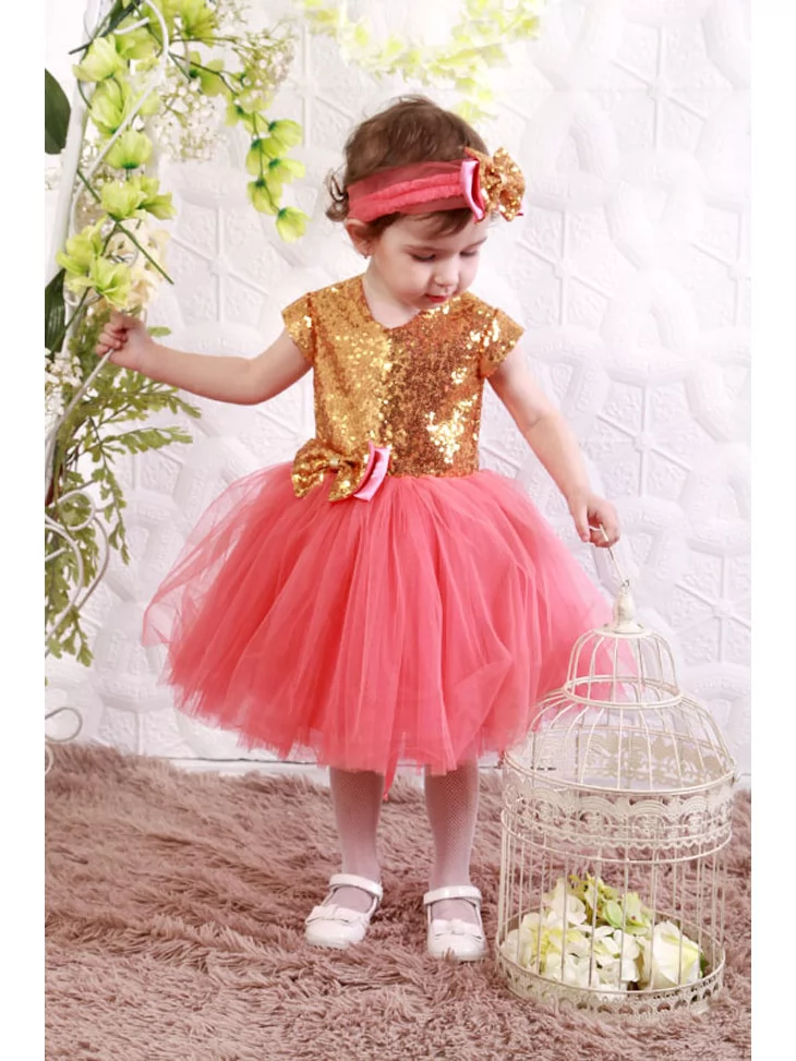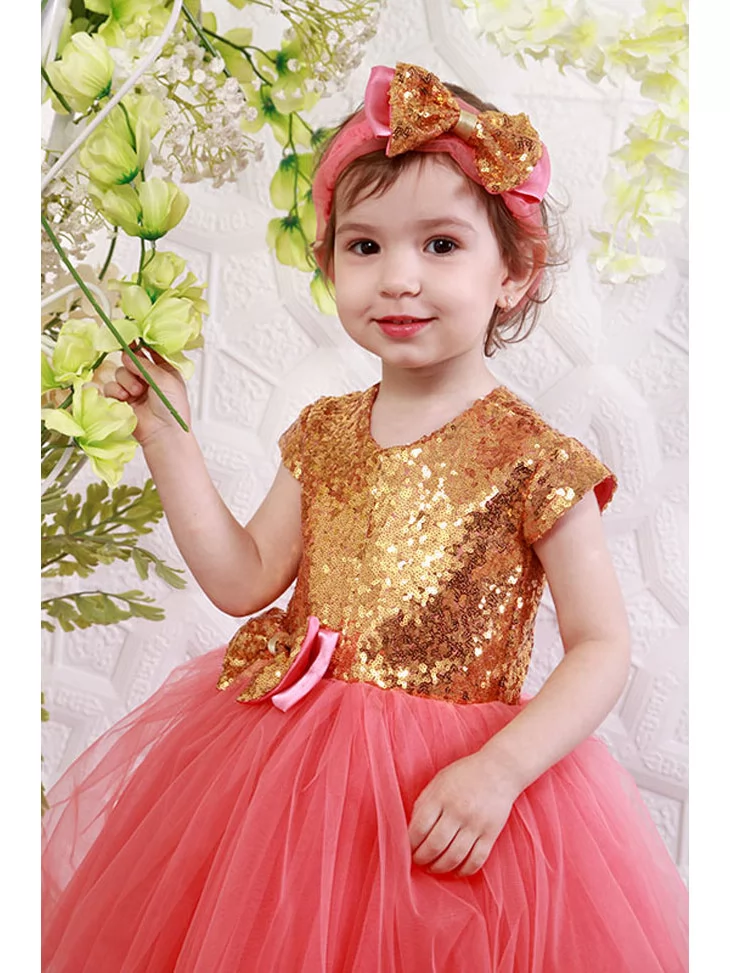 Солодкий святковий образ маленької карамельки, що сяє золотом і дарує навколо радість, ніжність та теплий настрій. Блискучий золотистий верх із паєтками гармонійно поєднується з пишною коралово-рожевою фатіновою спідницею, створюючи яскравий, але дуже ніжний силует. Декоративний бантик і стильна пов’язка з блискучим акцентом додають образу завершеності. Ідеальний варіант для оренди карнавальних костюмів на ранки, святкові фотосесії та тематичні події.