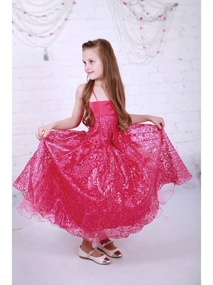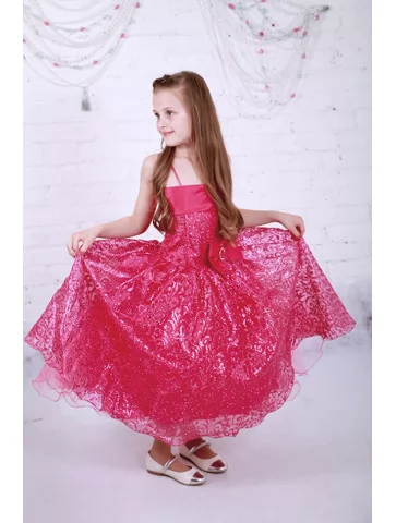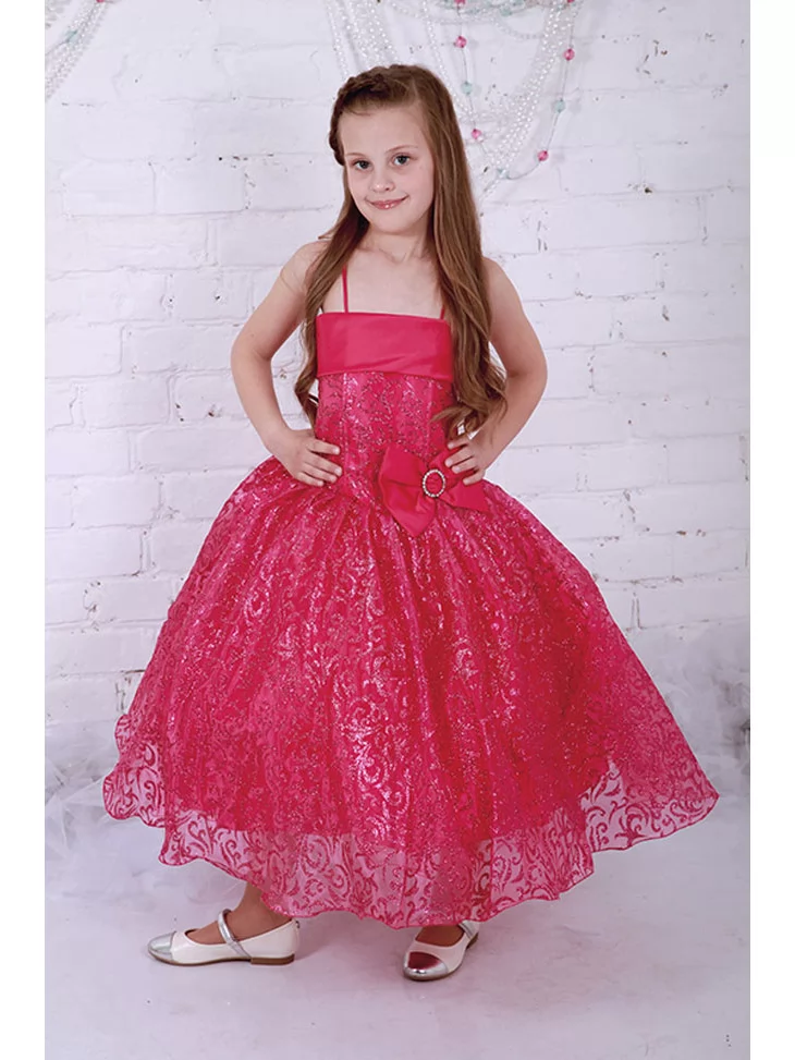 Рожева сукня з витонченим корсетом, прозорою мереживною спідницею з візерунками та декоративним бантом на талії створює розкішний силует маленької принцеси. Вона чудово підходить для урочистих подій і є прекрасним варіантом для оренди карнавальних костюмів на свята, фотосесії та виступи.