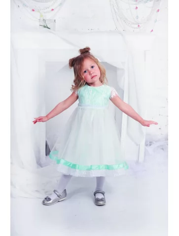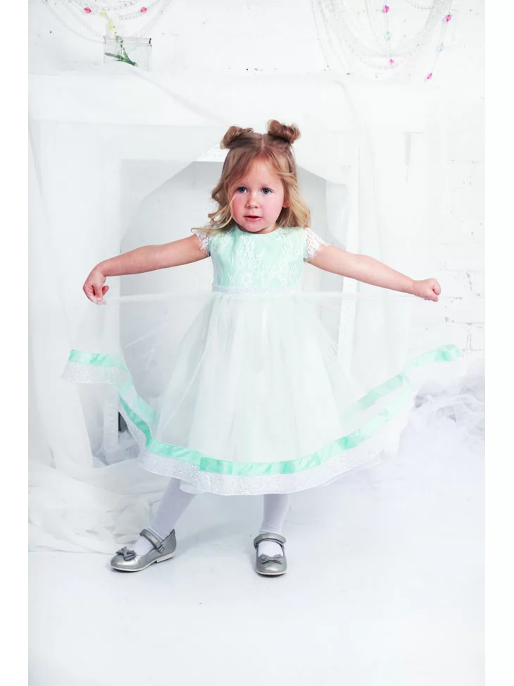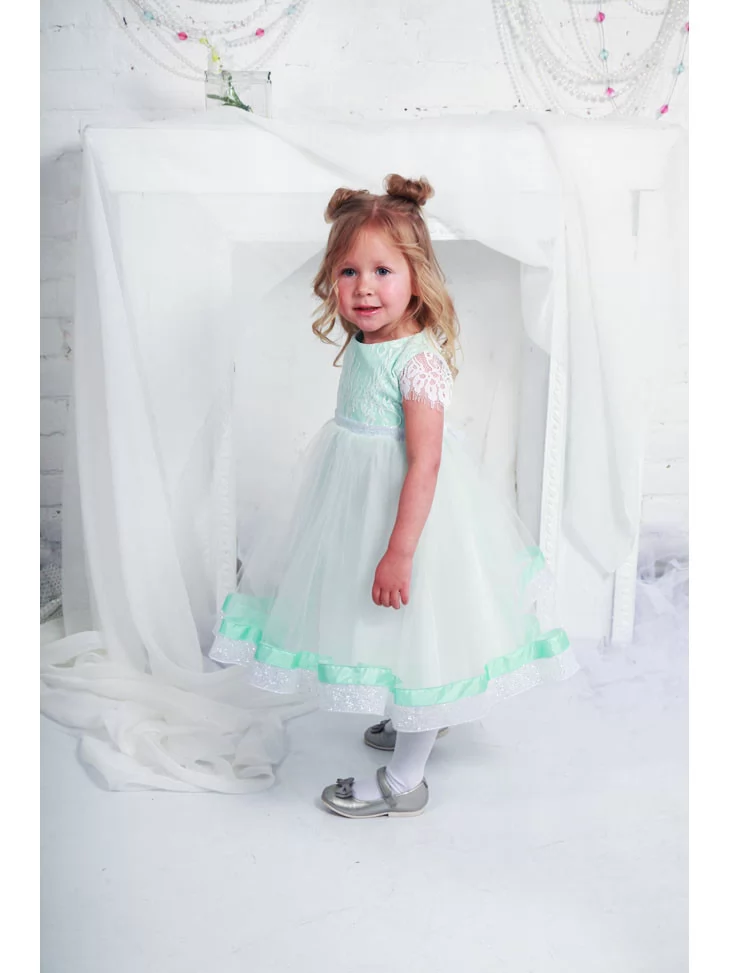 Сукня м’ятна з мереживним верхом та фатиновою спідницею подарує малечі справжню атмосферу казки — обирайте її у прокаті карнавальних костюмів для чарівних святкових моментів.