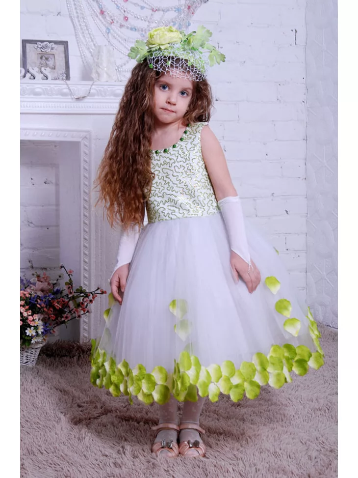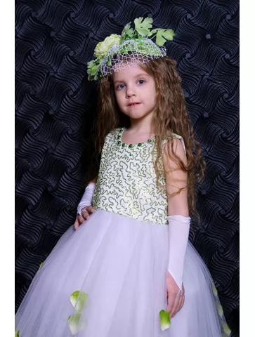 Романтичний образ розкішної півонії, що розквітає м’яко, світло й по-казковому витончено. Цей повітряний костюм у молочно-білих тонах із зеленими пелюстковими акцентами створює відчуття чистоти, свіжості та справжнього весняного дива. Делікатний ліф із візерунками та пишна фатінова спідниця, прикрашена квітковими елементами по краю, формують образ ніжної квітки, яка ніби щойно розпустилась у саду. Ідеальне рішення для оренди карнавальних костюмів на свята весни, виступи й фотосесії, де потрібна краса без перевантаження деталями.