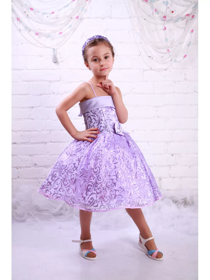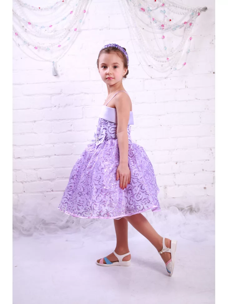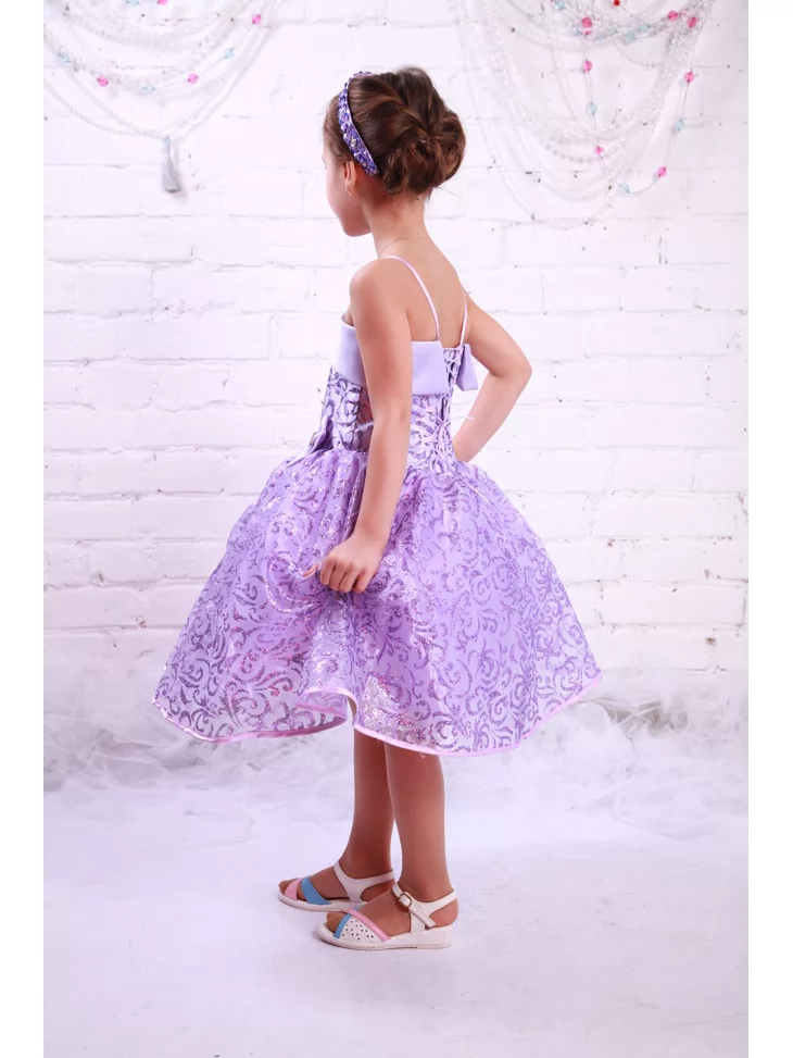 Витончений святковий образ у ніжному фіолетовому відтінку, що поєднує казкову легкість і справжню елегантність. Корсетний верх із декоративним візерунком гарно підкреслює силует, а пишна спідниця з мерехтливими елементами створює ефект руху й святкового сяйва. Цей образ чудово підходить для оренди карнавальних костюмів на дитячі події, фотосесії та урочистості, а також для прокату карнавальних костюмів, коли хочеться чогось по-справжньому чарівного та незабутнього.