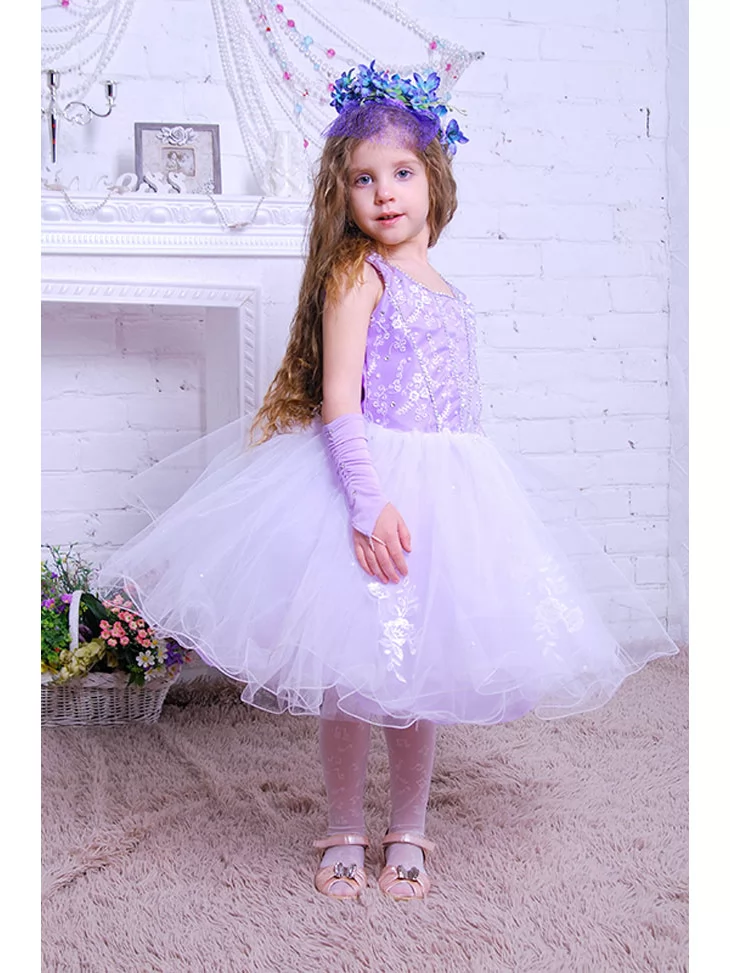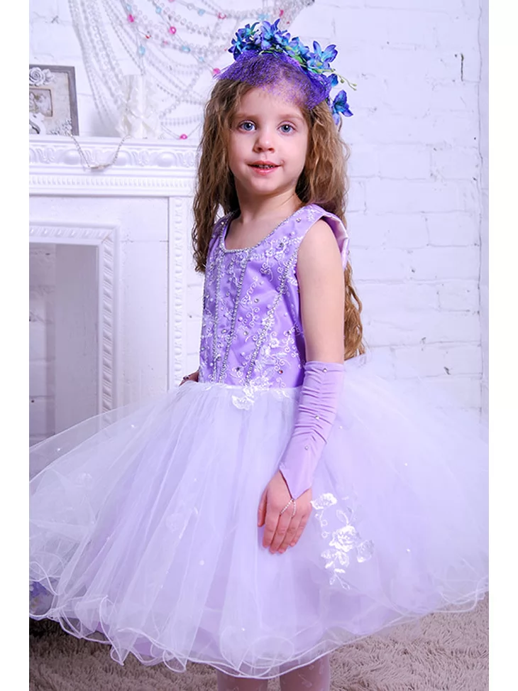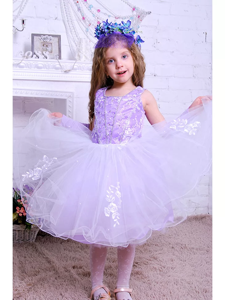 Ніжний чарівний образ, що ніби зійшов зі сторінок казки про квіти, світло та мрії. Ажурний ліф лавандового відтінку красиво переливається на світлі, а повітряна фатинова спідниця створює легкість руху й ефект справжньої принцеси. Цей образ ідеально підходить для оренда карнавальних костюмів на свята, фотосесії, ранки та урочисті події, де хочеться ніжності та чарівної атмосфери.
