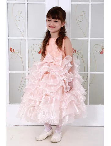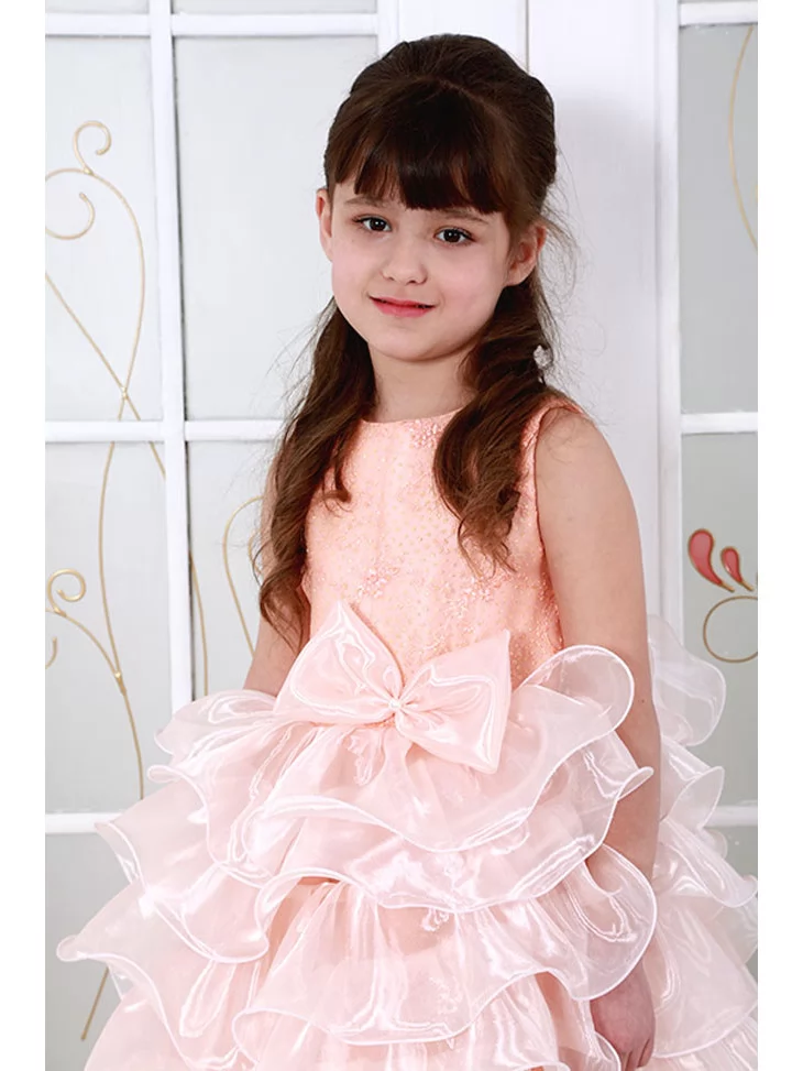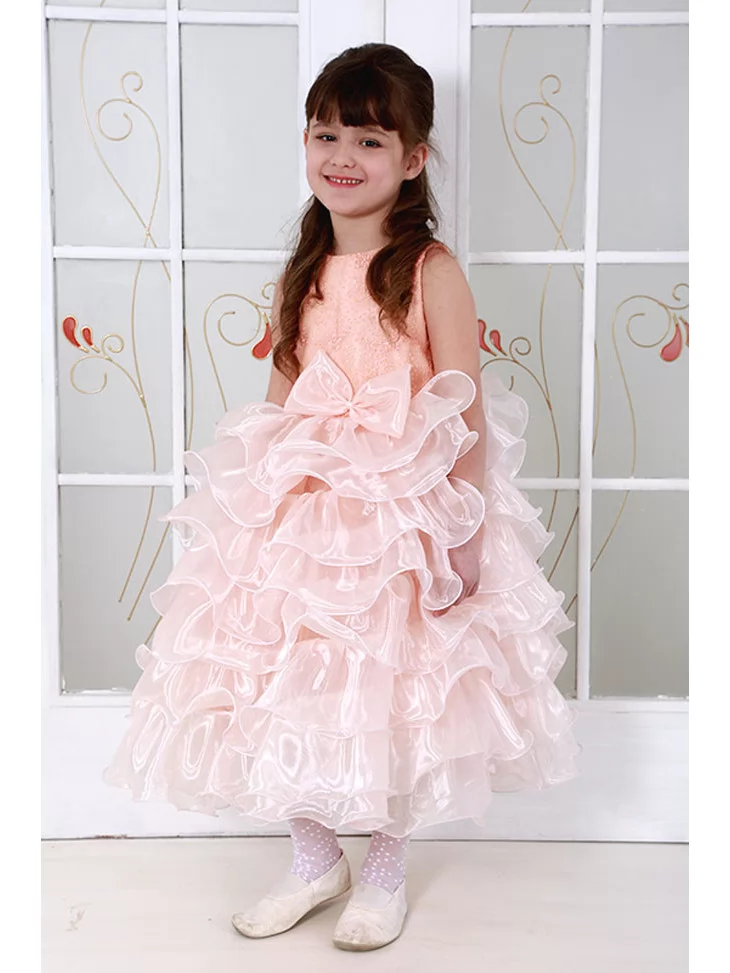 Сукня пудрова багатоярусна з пишними рюшами та бантом допоможе створити чарівний образ маленької принцеси — обирайте її у прокаті карнавальних костюмів для особливих святкових моментів.