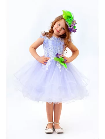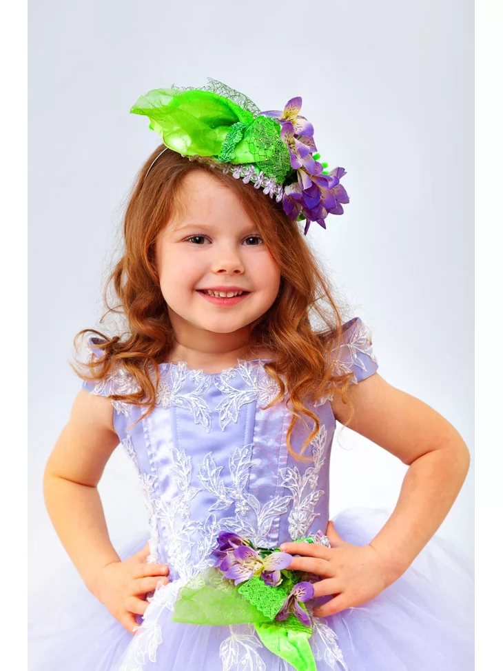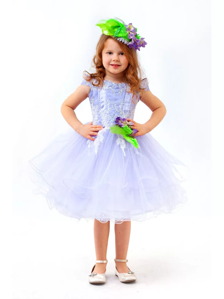 Ніжний образ першої квітки, що сміливо розквітає під теплими променями сонця та приносить із собою подих весни. Світло-лавандова сукня з повітряною фатіновою спідницею створює відчуття легкості й чистоти, а витончене мереживне оздоблення додає святкової елегантності. Яскраві зелені акценти та квіткові елементи гармонійно підкреслюють образ первоцвіту — тендітного, але яскравого символу нового початку. Це чудовий варіант для оренди карнавальних костюмів на весняні ранки, фотосесії та тематичні виступи.