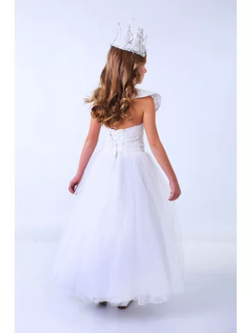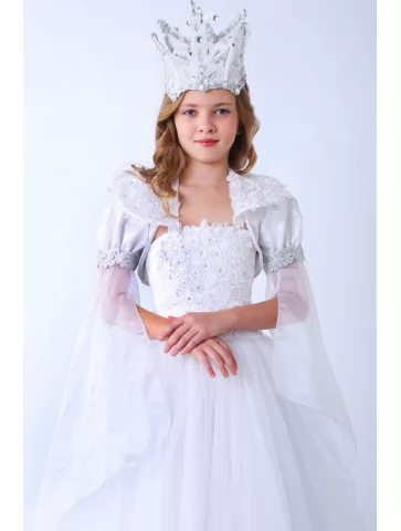 Елегантний, світлий образ зимової королеви, що поєднує ніжність, королівську велич і святкове сяйво. Цей костюм Снігової Королеви виглядає витончено й урочисто — мереживний корсет із делікатним блиском, пишна фатинова спідниця та розкішна крижана корона створюють справжню володарку зимового палацу. Легкий силует красиво рухається у танці й виглядає надзвичайно фотогенічно, тому оренда карнавальних костюмів у такому стилі стане чудовим вибором для новорічних свят, казкових вистав і фотосесій.