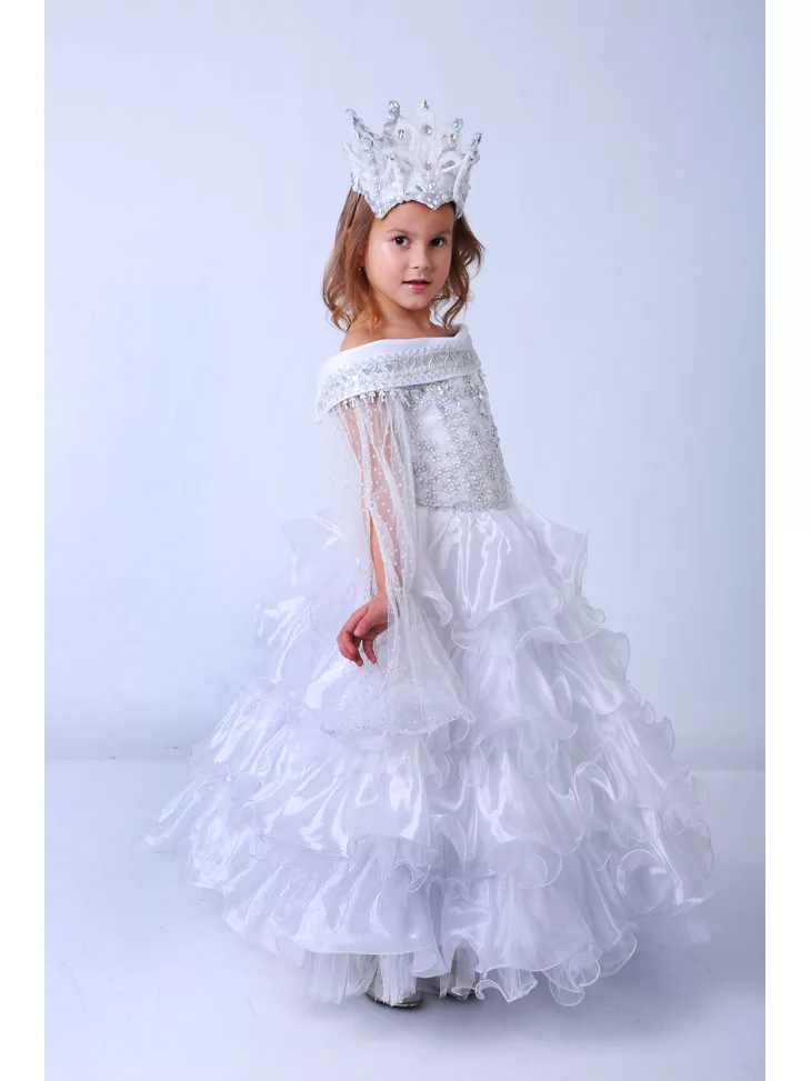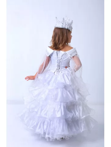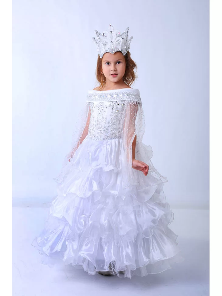 Ніжний і водночас урочистий образ, що виглядає немов створений із зимового сяйва та морозних візерунків. Прозорі рукави з мерехтливого фатину, розкішний декор корсета та багатоярусна хвиляста спідниця створюють відчуття легкості й чарівної величі. Це ідеальний варіант для оренди карнавальних костюмів на зимові свята, фотосесії та казкові вистави. Світла палітра тканин красиво переливається при освітленні, а корона з кришталевим ефектом завершує образ справжньої володарки снігу, яка ніби зійшла з казкової сцени.