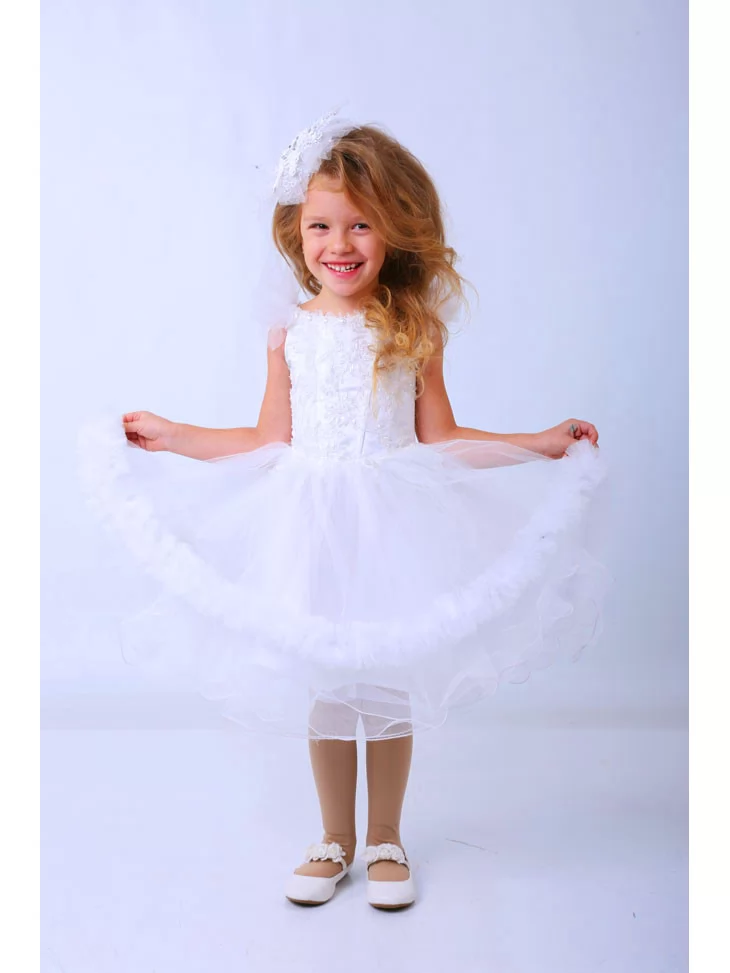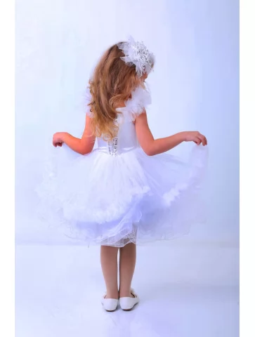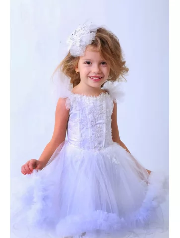 Повітряний, грайливий та по-справжньому зимовий образ, що нагадує пухнасту сніжинку, яка тихо опускається з неба. Фактурний верх із делікатним декором поєднується з пишною багатошаровою спідницею з фатину, створюючи відчуття легкості та святкової радості. Ідеальний варіант для оренди карнавальних костюмів на новорічні ранки, виступи та зимові фотосесії. Акуратний аксесуар у волоссі додає ніжності, а м’який силует дозволяє дитині вільно рухатися та танцювати.